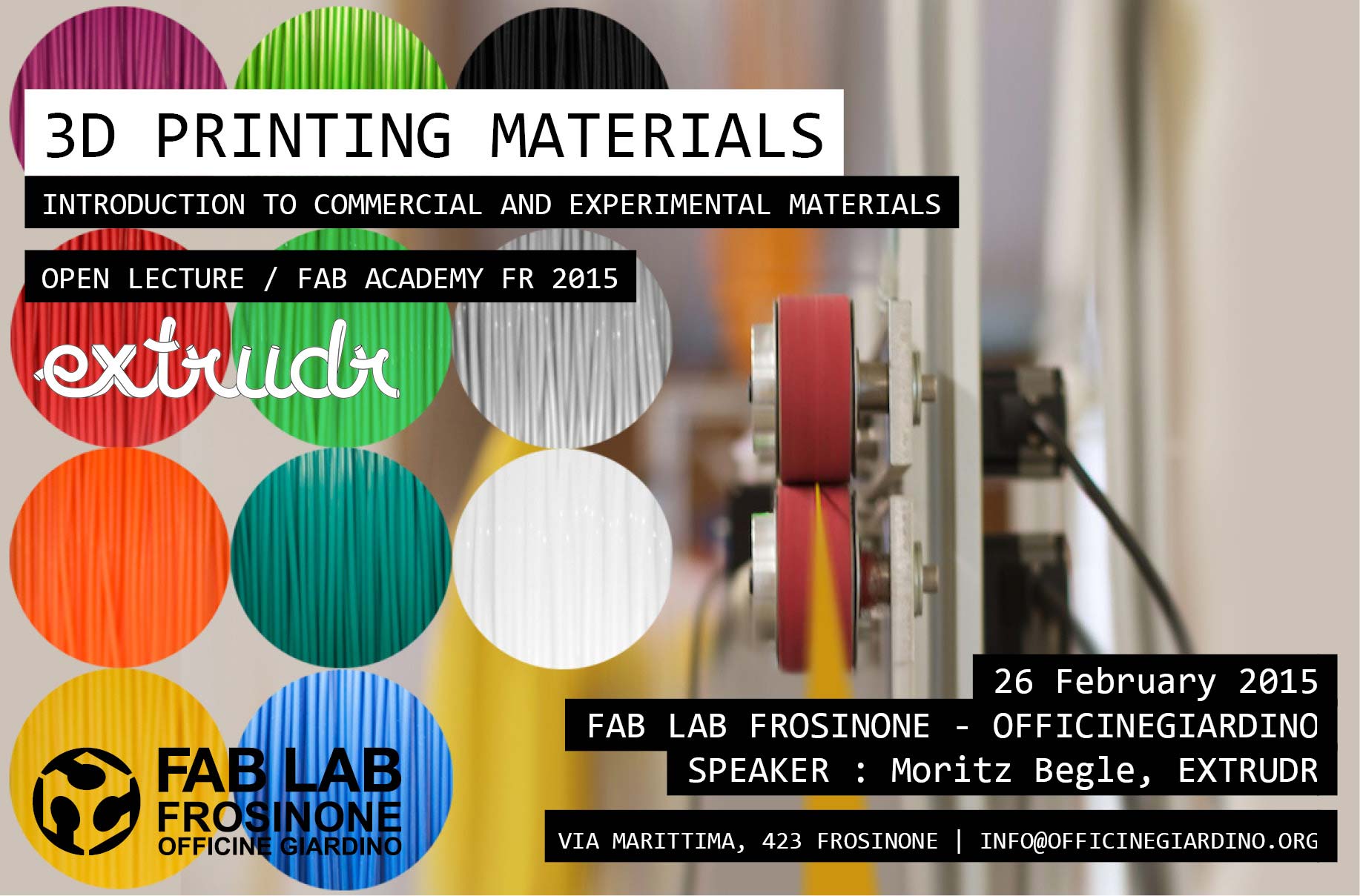 Mortiz Begle della start-up Extrudr – produttrice di filamento estruso in ABS e PLA di alta qualità – introdurrà al mondo dei materiali per la stampa 3D: una panoramica generale dei prodotti disponibili sul mercato e di quelli in via di sperimentazione. Questo webinar è dedicato agli studenti della Fab Academy 2015, ma è aperto a chiunque voglia partecipare. Vi aspettiamo!