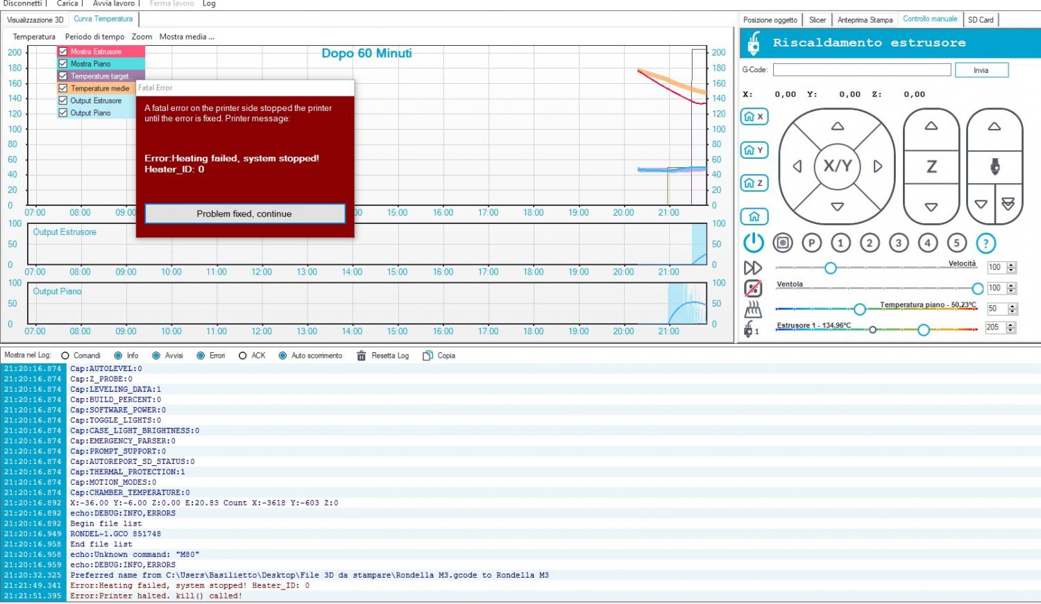 Basilietto Inviato 13 Aprile 2020 Autore Inviato 13 Aprile 2020 24 minuti fa, marcottt dice: Boh non capisco di cosa si lamenta visto che le temperature mi sembrano sensate.... Potresti fare un test senza mosfet. Oppure rifare pid... Oppure non saprei, forse reset eeprom. Perché per dare errore dovrebbe leggere una temperatura sballata ma nel grafico non la vedo. Prova a scorrere le ultime letture testo dalla stampante se per caso la temperatura fosse crollata a zero ma repetier non ha fatto in tempo a plottare.... Inviato dal mio tablet utilizzando Tapatalk Niente di anomalo, solo quelle diciture a fine blocco, ora sto provando senza mosfet. vediamo Cita