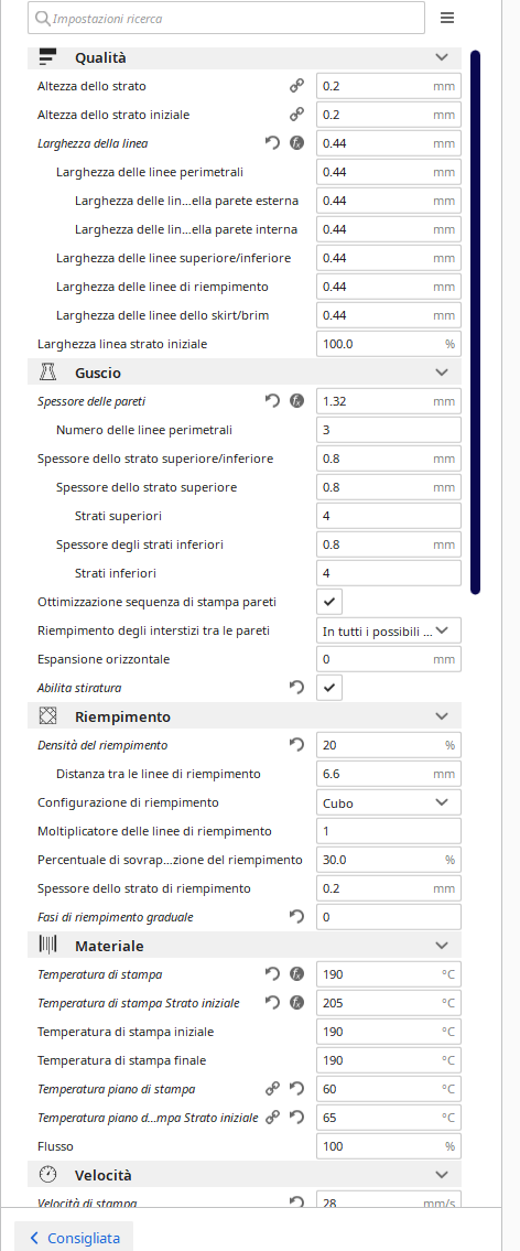 Killrob Inviato 6 Settembre 2020 Inviato 6 Settembre 2020 Prima di tutto togli la stiratura, la metterai dopo quando sarai più pratico, ho stampato questa notte dei pezzi simili ai tuoi con la Ender 3 a 60mms, 30mms per le pareti, 60mms per il riempimento, abilita lo z-hop con la stessa distanza dell'altezza layer e togli la retrazione al cambio layer. Se puoi non mettere il brim ma usa lo skirt 3 linee distanti 10mm dai pezzi stampati, per il pla sono sufficienti. Disabilita anche la modalità combing per il momento. 1 Cita
