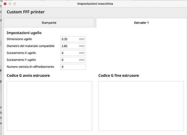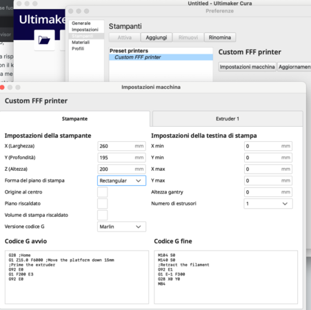 allora ho aperto le preferenze, sono andata su stampanti e aggiungi, ho cercato tra le stampanti non in rete e la delta wasp non è presente così ho selezionato custom e ho scelto custom fff printer (anche se non ho idea fff cosa significhi). Poi ho selezionato impostazioni macchina e ho provato ad inserire i dati che ho trovato su un tutorial sul sito della delta wasp, e qui mi sono fermata perché non so se questi parametri sono validi anche per l'argilla. (allego degli screenshot). Nella sezione materiali non ho messo nulla perché l'argilla non compare come opzione. Nella sezione profili non ho selezionato nulla.