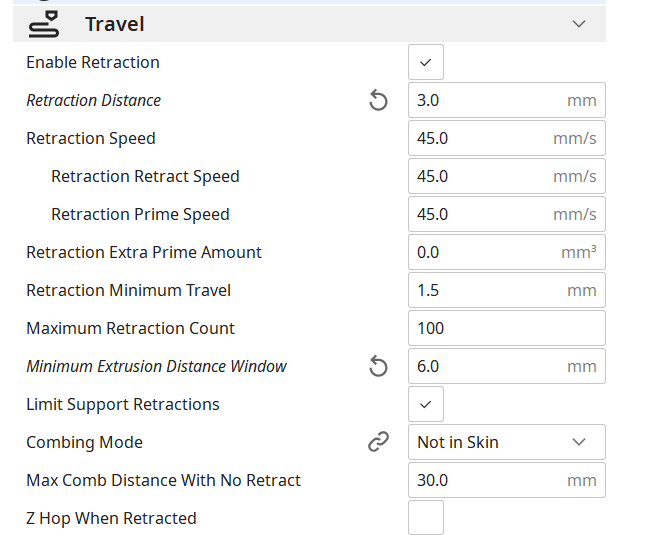 Li sto modificando in modo che la Retraction distance sia a 3mm (anche se nel video suggerisce esattamente il valore che già avevo impostato) e come conseguenza il valore della Minimun extrusion distance windows l'ho dovuto abbassare da 10 a 6mm (vedi seconda foto).