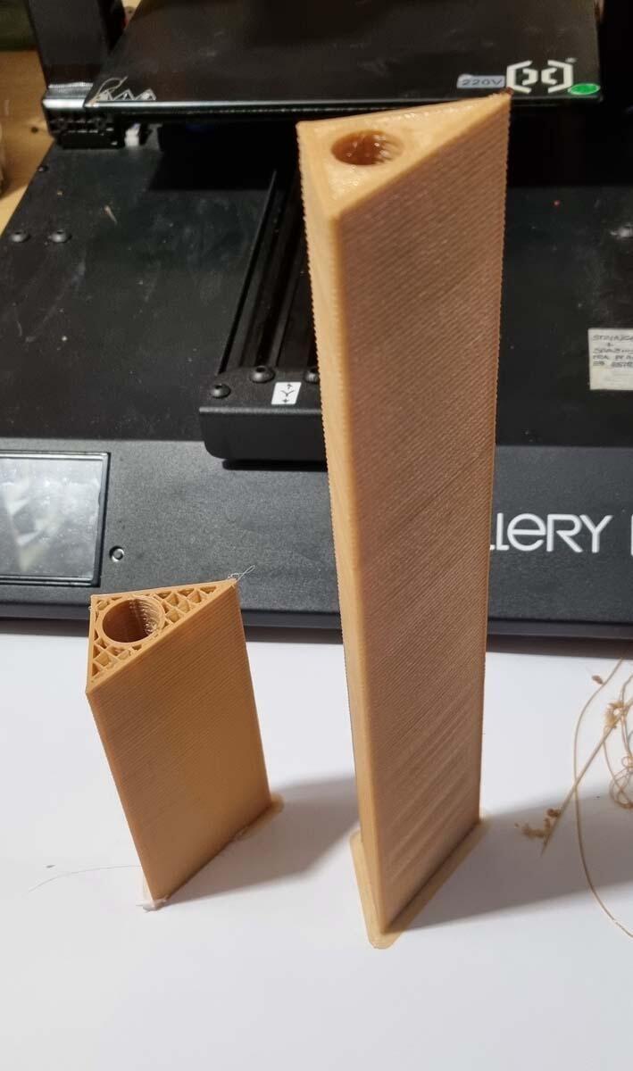 Un saluto a tutta la stupenda comunità di questo sito, sto stampando con la mia Artillery Genius questi oggetti, ora a destra c'e' un pezzo finito, successivamente ho avuto un problema con l'estrusore che si è intasato e non sono riuscito a smontarlo, si è spezzato ed ho cambiato così tutto il blocco (Estrusore + Sensori), rimontato, ed riavviata la stampa, dopo aver effettuato la livellazione del piano, con lo stesso file.gcode, la stampa e' ripartita benissimo, poi a un certo punto, l'ho trovata che continuava a stampare ma senza depositare filamento, come se per la stampante fosse tutto ok, e il filamento scorresse correttamente, il sensore del filamento era ok (led verde), ma non usciva più materiale dall'estrusore, ho pensato subito ad un intasamento dello stesso, oppure che il meccanismo di trasporto avesse instradato il materiale al di fuori dell'ingresso dell'estrusore, ma invece no, era tutto libero, tanto e vero che ho effettuato la procedura di estrazione (cambio filamente) e lo stesso e' uscito correttamente senza problemi, successivamente ho effettuato una serie di prove di estrusione da menu (IN / OUT) e sembra funzionare tutto correttamente, la bobina di materiale TPU è nuova ma è della stessa marca con la quale ho stampato altrettanti pezzi senza alcun problema (Ne ho stampati già una decina).