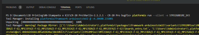 dnasini Inviato 19 Gennaio 2024 Autore Inviato 19 Gennaio 2024 @eaman l'ho postato completo nel post sopra... l'errore e' lo stesso PS D:\Documents\3D Printing\00-Stampante e Kit\CR-20 Pro\Marlin-2.1.2.1 - CR-20 Pro bugfix> platformio run --silent -e STM32G0B1RE_btt Tool Manager: Installing platformio/framework-arduinoststm32 @ ~4.20600.231001 Unpacking [####################################] 100% Tool Manager: Warning! Package Mirror: [('C:\\Users\\Administrator\\.platformio\\packages\\framework-arduinoststm32\\variants\\STM32MP1xx\\MP133AA(E-F-G)_MP133CA(E-F-G)_MP133DA(E-F-G)_MP133FA(E-F-G)_MP135AA(E-F-G)_MP135CA(E-F-G)_MP135DA(E-F-G)_MP135FA(E-F-G)\\boards_entry.txt', 'C:\\Users\\Administrator\\.platformio\\packages\\framework-arduinoststm32@src-06b9d2668dcd05a92820ac50e10b17c7\\variants\\STM32MP1xx\\MP133AA(E-F-G)_MP133CA(E-F-G)_MP133DA(E-F-G)_MP133FA(E-F-G)_MP135AA(E-F-G)_MP135CA(E-F-G)_MP135DA(E-F-G)_MP135FA(E-F-G)\\boards_entry.txt', "[Errno 2] No such file or directory: 'C:\\\\Users\\\\Administrator\\\\.platformio\\\\packages\\\\framework-arduinoststm32@src-06b9d2668dcd05a92820ac50e10b17c7\\\\variants\\\\STM32MP1xx\\\\MP133AA(E-F-G)_MP133CA(E-F-G)_MP133DA(E-F-G)_MP133FA(E-F-G)_MP135AA(E-F-G)_MP135CA(E-F-G)_MP135DA(E-F-G)_MP135FA(E-F-G)\\\\boards_entry.txt'"), ('C:\\Users\\Administrator\\.platformio\\packages\\framework-arduinoststm32\\variants\\STM32MP1xx\\MP133AA(E-F-G)_MP133CA(E-F-G)_MP133DA(E-F-G)_MP133FA(E-F-G)_MP135AA(E-F-G)_MP135CA(E-F-G)_MP135DA(E-F-G)_MP135FA(E-F-G)\\generic_clock.c', 'C:\\Users\\Administrator\\.platformio\\packages\\framework-arduinoststm32@src-06b9d2668dcd05a92820ac50e10b17c7\\variants\\STM32MP1xx\\MP133AA(E-F-G)_MP133CA(E-F-G)_MP133DA(E-F-G)_MP133FA(E-F-G)_MP135AA(E-F-G)_MP135CA(E-F-G)_MP135DA(E-F-G)_MP135FA(E-F-G)\\generic_clock.c', "[Errno 2] No such file or directory: 'C:\\\\Users\\\\Administrator\\\\.platformio\\\\packages\\\\framework-arduinoststm32@src-06b9d2668dcd05a92820ac50e10b17c7\\\\variants\\\\STM32MP1xx\\\\MP133AA(E-F-G)_MP133CA(E-F-G)_MP133DA(E-F-G)_MP133FA(E-F-G)_MP135AA(E-F-G)_MP135CA(E-F-G)_MP135DA(E-F-G)_MP135FA(E-F-G)\\\\generic_clock.c'"), ('C:\\Users\\Administrator\\.platformio\\packages\\framework-arduinoststm32\\variants\\STM32MP1xx\\MP133AA(E-F-G)_MP133CA(E-F-G)_MP133DA(E-F-G)_MP133FA(E-F-G)_MP135AA(E-F-G)_MP135CA(E-F-G)_MP135DA(E-F-G)_MP135FA(E-F-G)\\PeripheralPins.c', 'C:\\Users\\Administrator\\.platformio\\packages\\framework-arduinoststm32@src-06b9d2668dcd05a92820ac50e10b17c7\\variants\\STM32MP1xx\\MP133AA(E-F-G)_MP133CA(E-F-G)_MP133DA(E-F-G)_MP133FA(E-F-G)_MP135AA(E-F-G)_MP135CA(E-F-G)_MP135DA(E-F-G)_MP135FA(E-F-G)\\PeripheralPins.c', "[Errno 2] No such file or directory: 'C:\\\\Users\\\\Administrator\\\\.platformio\\\\packages\\\\framework-arduinoststm32@src-06b9d2668dcd05a92820ac50e10b17c7\\\\variants\\\\STM32MP1xx\\\\MP133AA(E-F-G)_MP133CA(E-F-G)_MP133DA(E-F-G)_MP133FA(E-F-G)_MP135AA(E-F-G)_MP135CA(E-F-G)_MP135DA(E-F-G)_MP135FA(E-F-G)\\\\PeripheralPins.c'"), ('C:\\Users\\Administrator\\.platformio\\packages\\framework-arduinoststm32\\variants\\STM32MP1xx\\MP133AA(E-F-G)_MP133CA(E-F-G)_MP133DA(E-F-G)_MP133FA(E-F-G)_MP135AA(E-F-G)_MP135CA(E-F-G)_MP135DA(E-F-G)_MP135FA(E-F-G)\\variant_generic.cpp', 'C:\\Users\\Administrator\\.platformio\\packages\\framework-arduinoststm32@src-06b9d2668dcd05a92820ac50e10b17c7\\variants\\STM32MP1xx\\MP133AA(E-F-G)_MP133CA(E-F-G)_MP133DA(E-F-G)_MP133FA(E-F-G)_MP135AA(E-F-G)_MP135CA(E-F-G)_MP135DA(E-F-G)_MP135FA(E-F-G)\\variant_generic.cpp', "[Errno 2] No such file or directory: 'C:\\\\Users\\\\Administrator\\\\.platformio\\\\packages\\\\framework-arduinoststm32@src-06b9d2668dcd05a92820ac50e10b17c7\\\\variants\\\\STM32MP1xx\\\\MP133AA(E-F-G)_MP133CA(E-F-G)_MP133DA(E-F-G)_MP133FA(E-F-G)_MP135AA(E-F-G)_MP135CA(E-F-G)_MP135DA(E-F-G)_MP135FA(E-F-G)\\\\variant_generic.cpp'"), ('C:\\Users\\Administrator\\.platformio\\packages\\framework-arduinoststm32\\variants\\STM32MP1xx\\MP133AA(E-F-G)_MP133CA(E-F-G)_MP133DA(E-F-G)_MP133FA(E-F-G)_MP135AA(E-F-G)_MP135CA(E-F-G)_MP135DA(E-F-G)_MP135FA(E-F-G)\\variant_generic.h', 'C:\\Users\\Administrator\\.platformio\\packages\\framework-arduinoststm32@src-06b9d2668dcd05a92820ac50e10b17c7\\variants\\STM32MP1xx\\MP133AA(E-F-G)_MP133CA(E-F-G)_MP133DA(E-F-G)_MP133FA(E-F-G)_MP135AA(E-F-G)_MP135CA(E-F-G)_MP135DA(E-F-G)_MP135FA(E-F-G)\\variant_generic.h', "[Errno 2] No such file or directory: 'C:\\\\Users\\\\Administrator\\\\.platformio\\\\packages\\\\framework-arduinoststm32@src-06b9d2668dcd05a92820ac50e10b17c7\\\\variants\\\\STM32MP1xx\\\\MP133AA(E-F-G)_MP133CA(E-F-G)_MP133DA(E-F-G)_MP133FA(E-F-G)_MP135AA(E-F-G)_MP135CA(E-F-G)_MP135DA(E-F-G)_MP135FA(E-F-G)\\\\variant_generic.h'")] Cita