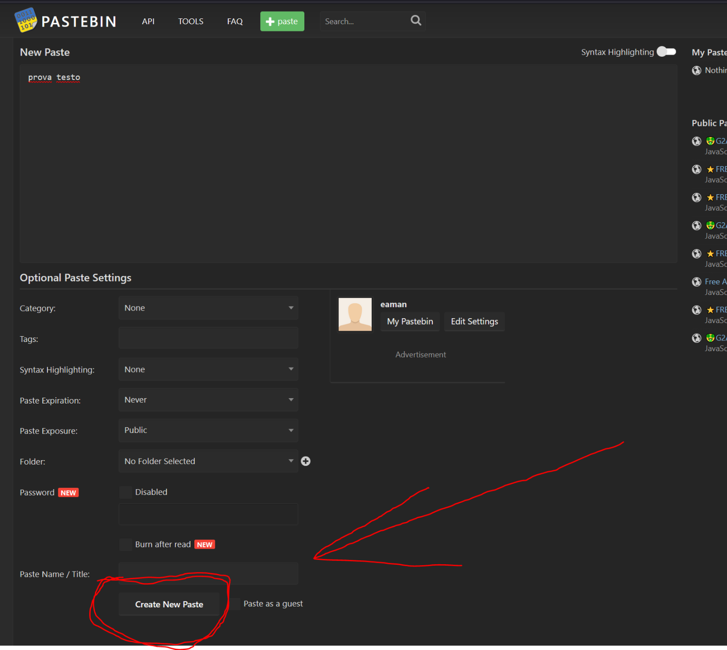 eaman Inviato 22 Luglio 2024 Inviato 22 Luglio 2024 Quando usi pastebin: 1. incolla il testo nella TEXT AREA 2. Clicca in basso su " CREATE NEW PASTE" 3. Condividi il link generato, la URL della pagina, l'indirizzo 1 1 Cita