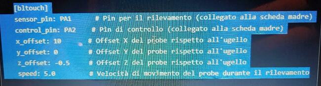 maxl70 Inviato Domenica alle 20:36 Inviato Domenica alle 20:36 10 ore fa, dnasini ha scritto: questa e' la mia config Ho aggiunto le ultime righe che mancavano alla mia sezione bed mesh rispetto alla tua E nemmeno in questo modo mi schiodo dal solito errore.. "no trigger on probe after full movement". Il pispolo sale e scende regolare.. l'unica cosa non fa è il colore blu... che faccio, provo a smontare la sonda? Cita