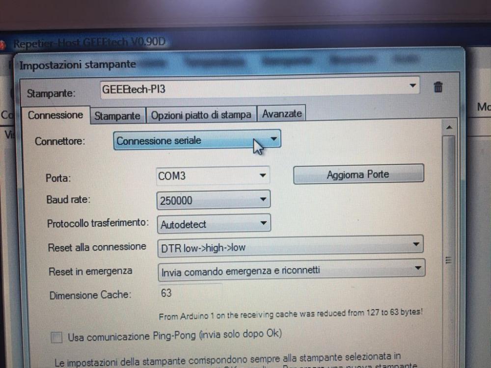 ilenia Inviato 16 Aprile 2018 Autore Inviato 16 Aprile 2018 9 minuti fa, Gigi dice: ok scusami. avevo un cartella con nome diverso e non ricordavo. cosa dice quando colleghi repetier. puoi mettere una foto? si certo ! grazie dei tuo aiuto.. :) 23 minuti fa, Marcottt dice: metti anche una foto della gestione del pc, e ricorda che oltre ad impostare la com giusta devi avere anche la velocità giusta (di solito 127.000 oppure 250.000). guarda questa immagine (rubata a @Alep :-) ) da pannello di controllo -> gestione dispositivi ti faccia una schermata tipo questa attaccando e staccando il cavo usb la mia immagine è questa .. e la velocità è su 250000 Cita