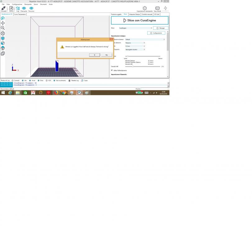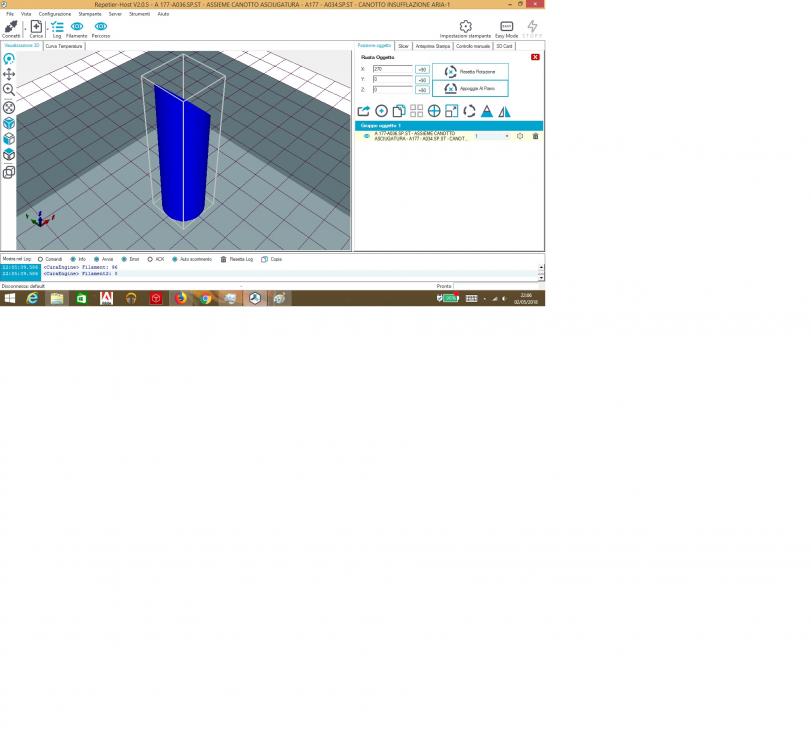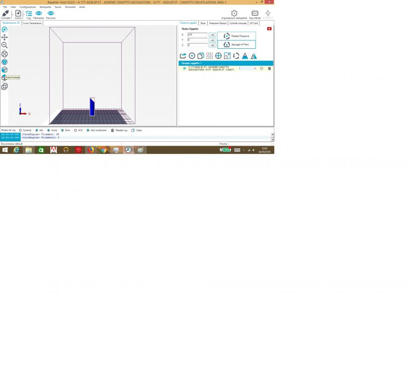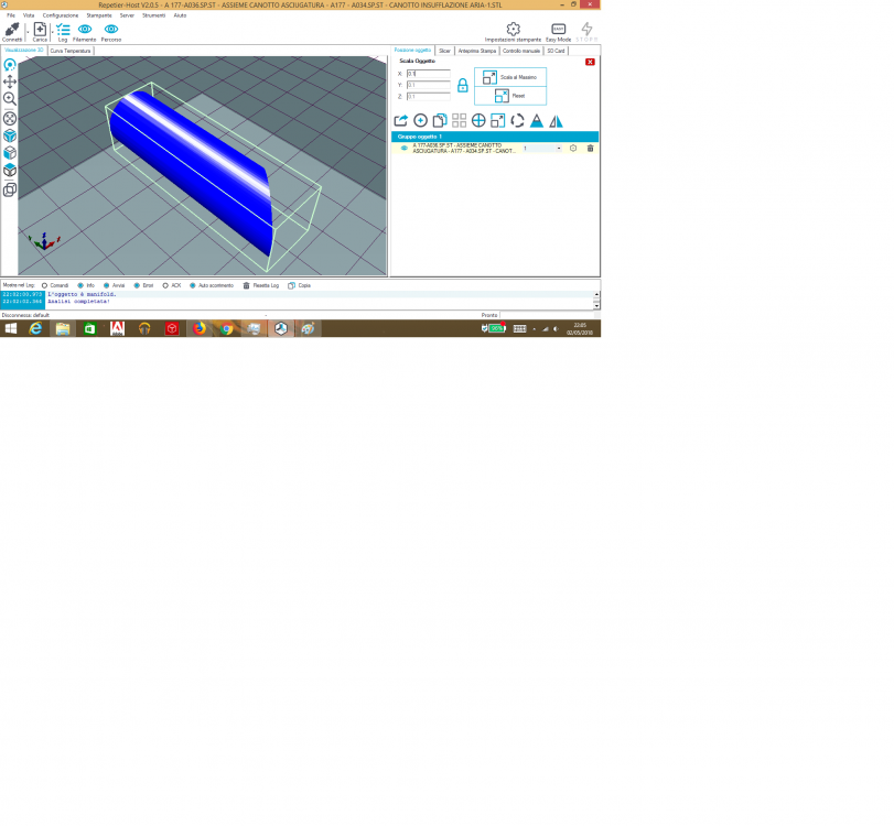 MATTIAMASE Inviato 1 Maggio 2018 Inviato 1 Maggio 2018 Buongiorno a tutti, ho un problema con la mia Anet A8 e software repetier. Ho disegnato un esecuzione speciale di un modello che vorrei realizzare in 3d come modellino la maggior parte dei pezzi me la stampa tranquillamente senza problemi , la importo, la scalo nel formato che mi interessa (uso la scala 0.1) la sistemo sul piano e stampo . Ma con i disegni dei tubi ho dei seri problemi, li importo, li scalo se li lascio orizzonatali sul piano mi stampa una base e basta se li metto per il verticale mi dice che almeno un oggetto e fuori dal piano ma le misure sono ben inferiori alle massime misure del piano di stampa che sono 220x220x240H l'oggetto scalato sarà in scala un tubo di un cm di diametro per 5 cm di altezza quindi non capisco. Qualcuno puo aiutarmi? Cita