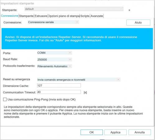 chiattillo.doc Inviato 31 Dicembre 2023 Inviato 31 Dicembre 2023 Il 17/12/2018 at 21:09, Bosco ha scritto: Dunque, tutto sembra corrispondere a quanto mi dite, ma continuo a non avere comunicazione fra Repetier Host e stampante. In alto si vede che la stampante è correttamente collegata alla porta COM4. In basso i parametri di impostazione stampante che sono quelli che mi avete indicato In questa invece in alto a sinistra si vede che la stampante viene interpretata come connessa e a destra ho tutti i tasti di controllo della stampante attivi, ma se li vado a spingere e aspetto che il programma "invii" il segnale non vedo alcuna risposta dalla stampante. Sinceramente finora non ho fatto test di stampa da scheda SD, non saprei dire se mi interessa fino in fondo avere un controllo diretto da computer. Sto facendo i primi passi, perciò non mi rendo conto delle mie reali necessità. Certamente se però riesco a risolvere questo handicap sono più contento. Ancora grazie per la disponibilità ho visto il post un po vecchio ma sei poi riuscito a risolvere ho lo stesso problema? Il 17/12/2018 at 21:09, Bosco ha scritto: Dunque, tutto sembra corrispondere a quanto mi dite, ma continuo a non avere comunicazione fra Repetier Host e stampante. In alto si vede che la stampante è correttamente collegata alla porta COM4. In basso i parametri di impostazione stampante che sono quelli che mi avete indicato In questa invece in alto a sinistra si vede che la stampante viene interpretata come connessa e a destra ho tutti i tasti di controllo della stampante attivi, ma se li vado a spingere e aspetto che il programma "invii" il segnale non vedo alcuna risposta dalla stampante. Sinceramente finora non ho fatto test di stampa da scheda SD, non saprei dire se mi interessa fino in fondo avere un controllo diretto da computer. Sto facendo i primi passi, perciò non mi rendo conto delle mie reali necessità. Certamente se però riesco a risolvere questo handicap sono più contento. Ancora grazie per la disponibilità Ho lo stesso problema, sei poi riuscito a risolvere? vedo che il post è un po datato... Cita