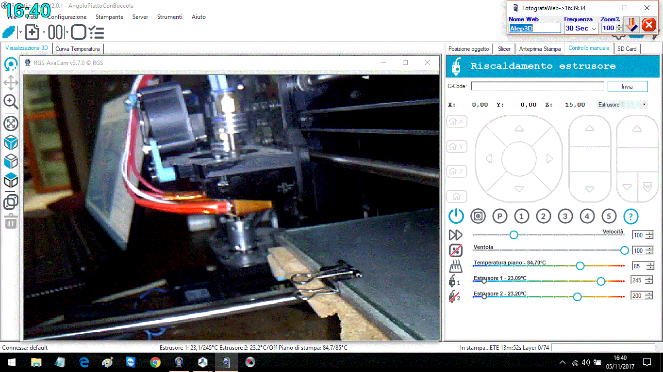 Alep Inviato 18 Marzo 2019 Inviato 18 Marzo 2019 Io l'ho messa sul'asse Z dalla parte opposta all'home Z. E' vero che cosi vicino al piatto non è possibile averla ben a fuoco in tutti i punti del piatto ma in cambio non ho problemi con l'altezza del pezzo. Questo è un print screen dove si vede anche come la camera riprende,, Purtroppo non è fatto mentre stampa. Questo mi consente con l'aiuto di chrome remote desktop di tenere sott'occhio la stampa e poterla controllare anche da remoto e con qualche acrobazia anche da smartphone. Cita