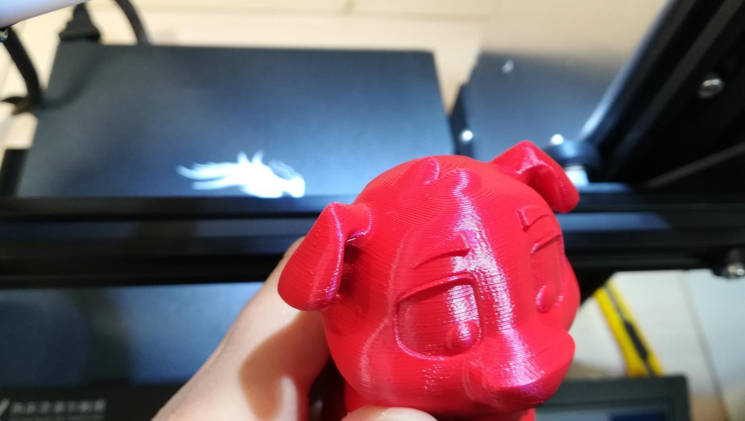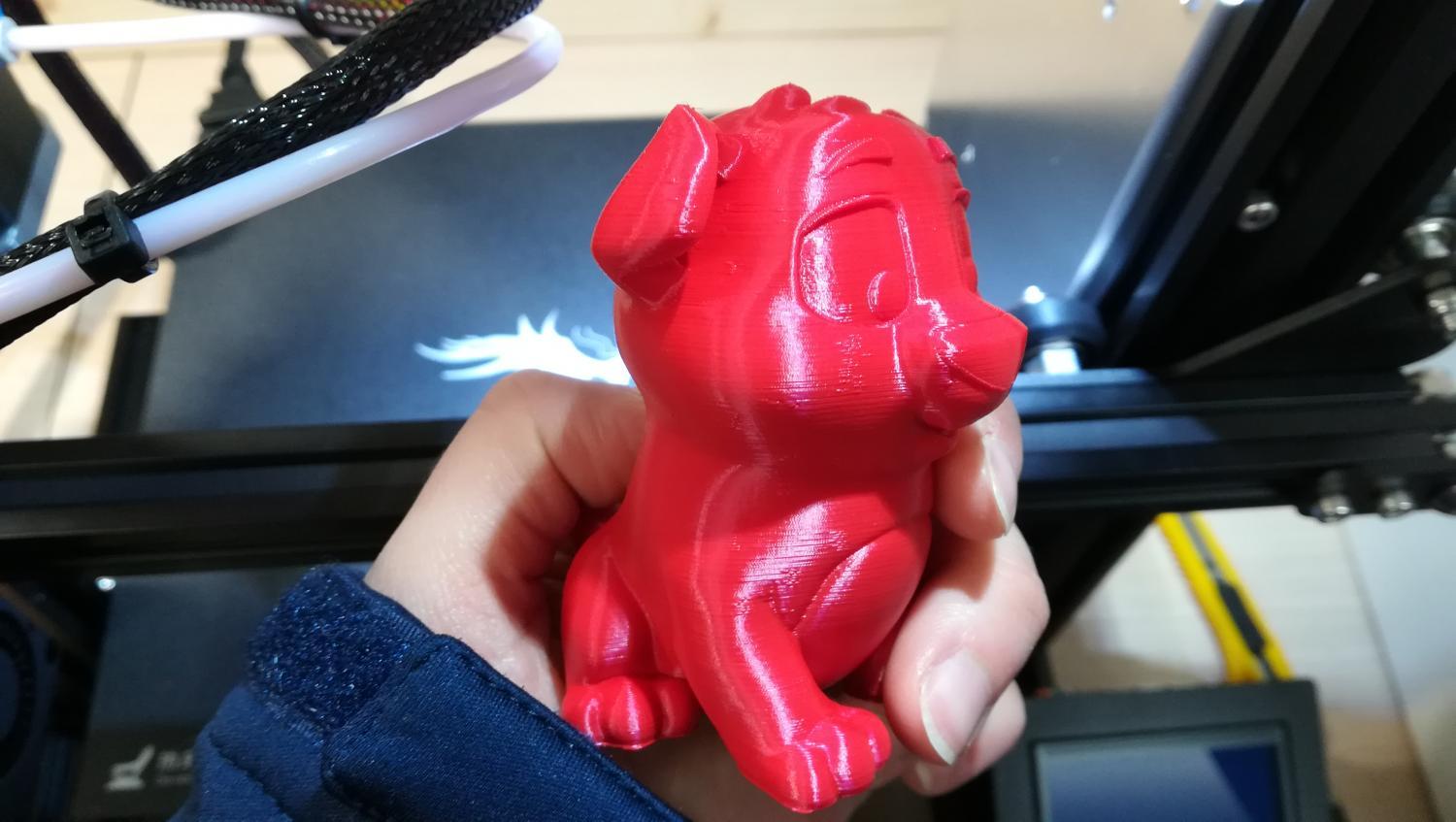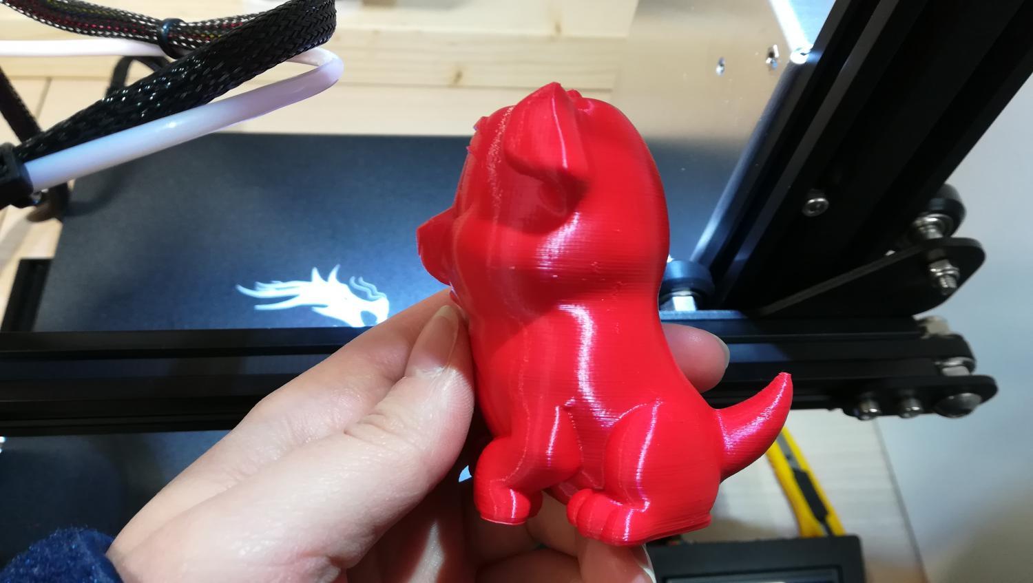 Blacksoldier10 Inviato 3 Aprile 2019 Inviato 3 Aprile 2019 Ender 3 Pro arrivata, montata e messa in bolla. Non ho volutamente calibrare nulla, fingendomi un utente inesperto (non così tanto inesperta perchè ho livellato il piatto prima 🤣) l'ho mandata subito in stampa per metterla alla prova. Primo tentativo fallito: avevo livellato il piatto lasciando 0.1 di spazio tra ugello e bed, ma al momento della stampa era troppo alto. Fermata subito, livellata a 0.05 e ri mandato in stampa. Ed ecco le foto della stampa. Come potrete notare il cagnolino è venuto piuttosto bene, alto circa 7-8 cm, stampato in 6-7 ore. Layer iniziale 0.2, layer successivi 0.15. Invece del filamento che mi fornisce la Creality stessa, ho preferito usare il Tianse rosso. Temperatura estrusore 200 gradi, piatto a 50 gradi. Nel gcode della casa era previsto un abbondante brim di 20 righe più o meno (avevano paura che si staccava? 😂) più i supporti per le orecchie, abbastanza evitabili. Adesso mi avvio in una spirale di test/calibrazioni prima di buttarmi su qualche stampa "seria" come prova del 9 4 Cita