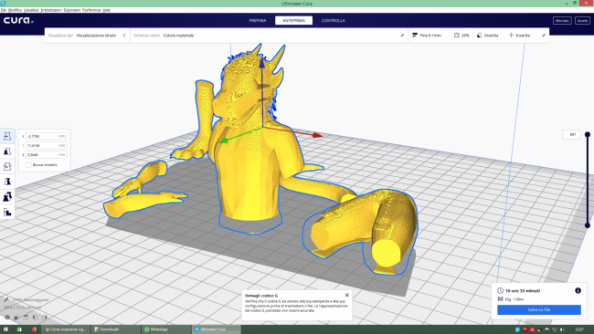 Gigiuz Inviato 27 Aprile 2019 Autore Inviato 27 Aprile 2019 Ecco, allora faccio prima a dargli una dimensione "giusta" con blender e poi converto in stl. Aprendo il tuo file con Craftware, nello slice mi appare così: Seguendo il tuo consiglio di cercare un stl repair, ho utilizzato Netfabb, inserendo quindi il suo file su Craftware, mi appare migliore... tu che dici? Cita