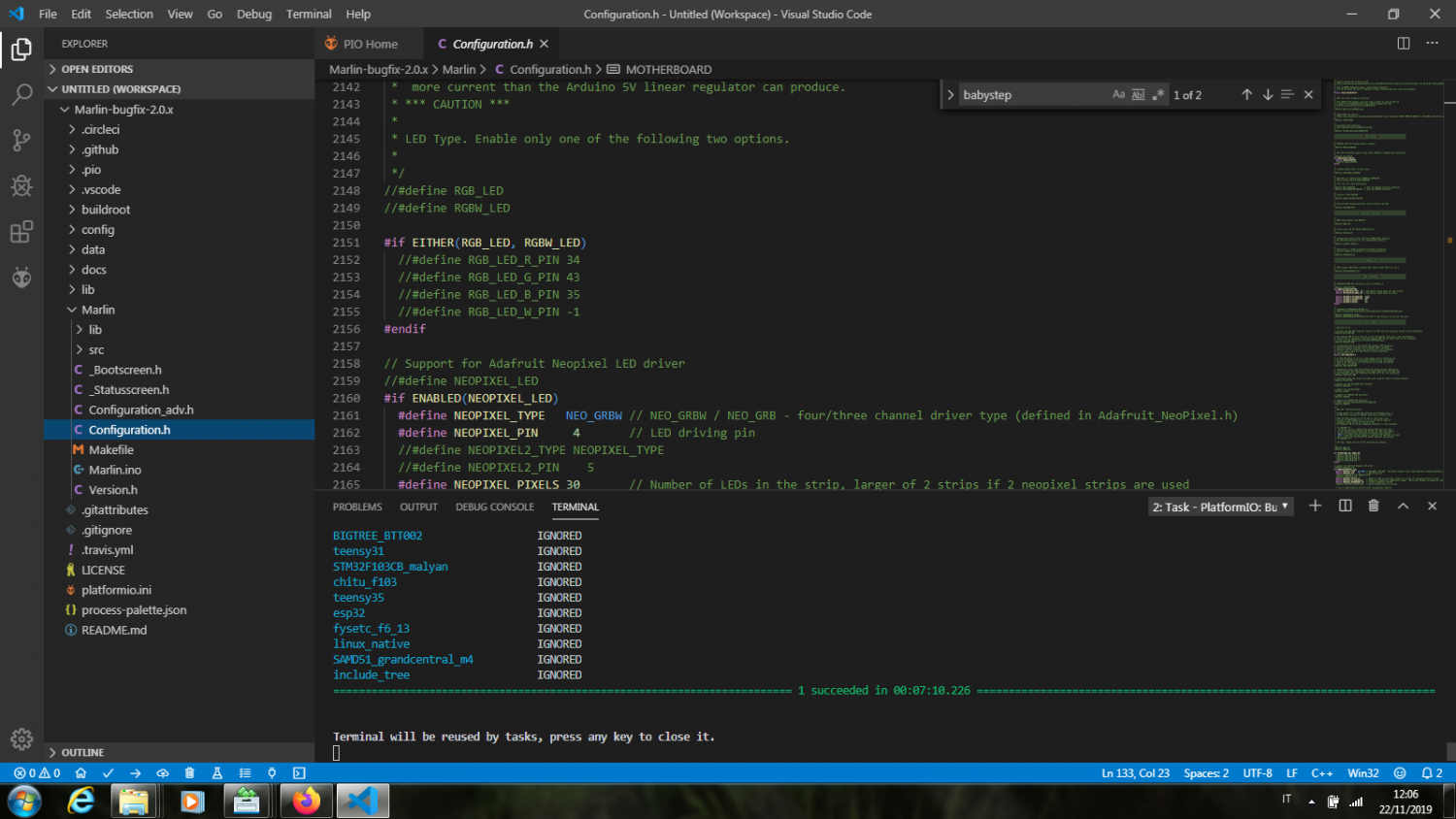 Adesso aspettiamo @Tomto che sono curioso di capire cosa ha fatto, però io ho appena scaricato la versione più aggiornata di Vscode e attivato il plugin di platformio, ho scaricato i tuoi file config che avevi postato qualche gg fa e a parte un problema di definizione con i babystepping, che ho momentaneamte risolto disabilitando quella funzione, la compilazione è andata a buon fine.