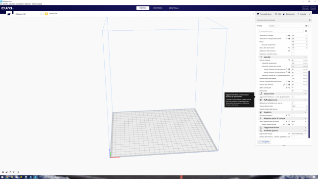 Eseguo lo slicing con cura;i settaggi secondo me sono decenti