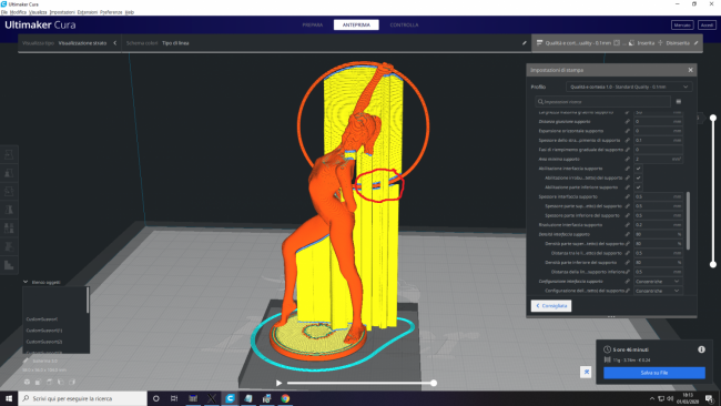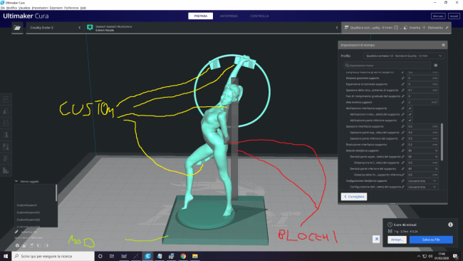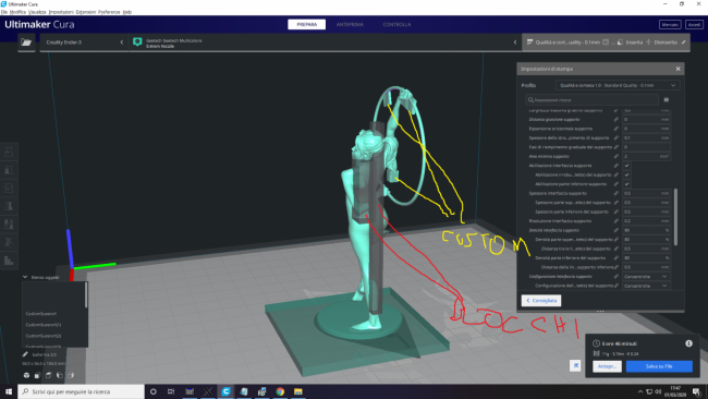 Shini3D Inviato 1 Marzo 2020 Autore Inviato 1 Marzo 2020 5 ore fa, invernomuto dice: Peccato, stava venendo bene. Però mi sembra che per quel modello i supporti messi prima siano troppo "pesanti". sono diventato matto per modificare i supporti fra custom blocchi e settaggi.. non sono riuscito a togliere la giunzione che si vede evidenziata con il cerchio rosso nonostante "distanza giunzione supporto" sia a 0.. sono in dubbio sul supporto sotto la gamba sx.. consigli? Cita