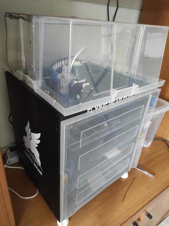 Io son andato x ragionamento... Non è detto che sia ottimale... Avevo paura d bruciare il motore e mi son detto che se quella tensione era appropriata prima teoricamente avrebbe dovuto esserlo dopo....x la copertura .. no ancora non l ho fatta... Ma scoperta non mi piaceva... Così alla veloce ho trovato una vasca trasparente più o meno di misura... L ho tagliata a metà così l ho fatta diventare d misura... E poi le ho applicato 4 magneti al neodimio in basso così sta ferma sul telaio senza però essere definitiva... Se avrò poi tempo e voglia farò quella fissa... X ora va talmente bene che quando stampo pla devo aprirla sennò tiene così bene il calore che l' estrusore mi mastica il filamento e la stampa si blocca...