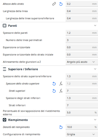 Ciao, Calibrazioni meccaniche asse Z, e piatto. In oltre ho rivisto Temperatura, flussi, Retrazione, Velocità ventola. Non ho toccato la misura del filamento estruso perché dal test del cubetto era già piuttosto preciso. Se aumento il flusso del primo layer temo poi di trovarmi con l'effetto zampa di elefante. Su Cura dove aumento il n di layer del primo strato, dal menu Pareti? -