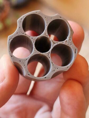 Ho provato a stamparlo inclinato di 45° ma la stampa è fallita. Forse perché le punte alla base del triangolo sono troppo fini. Riproverò con una inclinazione diversa -
