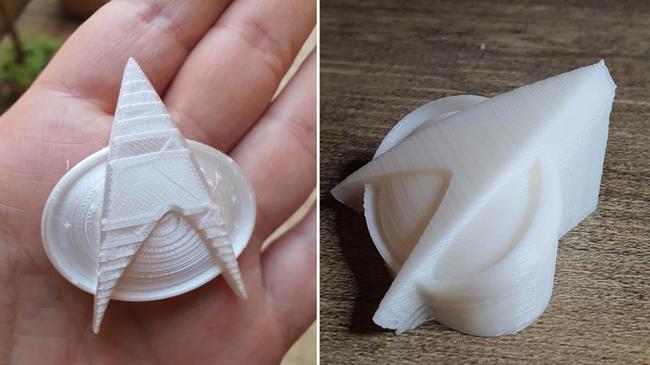 Con la Anycubic Mega S ho stampato questo badge in orizzontale, ma gli ultimi strati del "delta" sono venuti molto scalettati. In quel punto l'oggetto è leggermente curvato. Dietro consiglio di utenti di un altro tipo di forum ho provato a stamparlo inclinato di 30° e con il supporto. La stampa è migliore sulla superficie del delta ma peggiore sul resto del pezzo e togliere tutto quel supporto da un pezzo così piccolo è peggio che carteggiare e stuccare il difetto del pezzo stampato orizzontale. Purtroppo i filamenti sono diversi, nel primo caso ho usato il campione fornito da Anycubic e il secondo, quello inclinato è stato fatto con un Sunlu bianco. Stampa a 0.2 riempimento 25, gli altri parametri sono quelli di default che mi da Cura. Che consiglio potete darmi per una stampa di questo tipo? Cura da la possibilità di intervenire sugli ultimi strati per limitare il problema? -