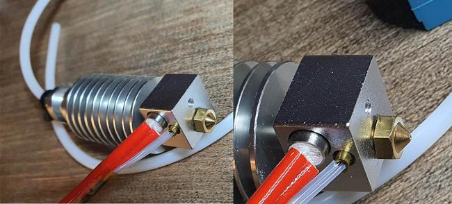 Ecco la foto dell'estrusore e del nozzle. Dove è montato l'ugello c'è un cappuccetto azzurro di gomma che ho levato per la foto. Ieri ho ordinato questi, indipendentemente dalla qualità, a occhio mi pare vadano bene https://www.amazon.it/gp/product/B089ZV17K5/ref=ppx_yo_dt_b_asin_title_o00_s00?ie=UTF8&psc=1 -