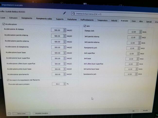C'è qualcosa di troppo negli angoliTuttoslot ha risposto a Tuttoslot nella discussione Problemi generici o di qualità di stampa Grazie Eaman, per il jerk ho già fatto una prova, impostandolo a 8 (xy) tramite lo slicer (ideamaker) è già migliorato qualcosa nella qualità di stampa rispetto alle impostazioni di default, ma c'è ancora da lavorare. Per l'estrusione devo ricontrollare tutto, che mi sa ho fatto qualche casino all'inizio. Grazie per avermi dato una strada certa da seguire per risolvere il problema