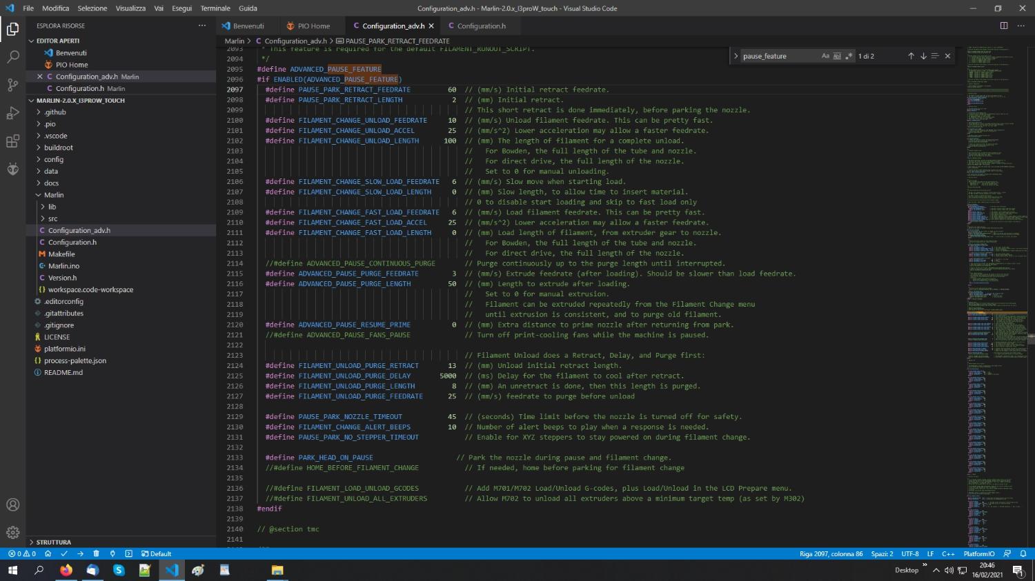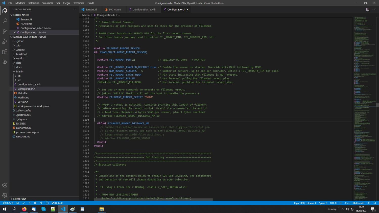 Veniamo al dunque, ho provato ad installare il sensore di fine filamento con semplice micro, sulla mia Geeetech I3Pro W (scheda 2560 A+) ma non riesco a farlo funzionare. Il firmware è Marlin2.0.7.2 con i 2 file Configuration.h e Configuration.adv.h dedicati che compilo e carico con PlatformIO. Ho abilitato #define FILAMENT_RUNOUT_SENSOR ed ho aggiunto una linea #define FIL_RUNOUT_PIN 28 per abilitare il pin 28 dove l'ho collegato. Il pin 28, sulla mia scheda è Y_MAX ed è inutilizzato. Ho poi abilitato #define USE_YMAX_PLUG ma non succede nulla. Probabilmente c'è da cambiare qualcosa in Confiruration.adv.h dopo la linea 2095 (M600) ma non so come impostare per il solo cambio filamento con estrusore senza bowden. Qualche suggerimento? Qualche video o tutorial in rete che mi è sfuggito? Grazie, Domenico