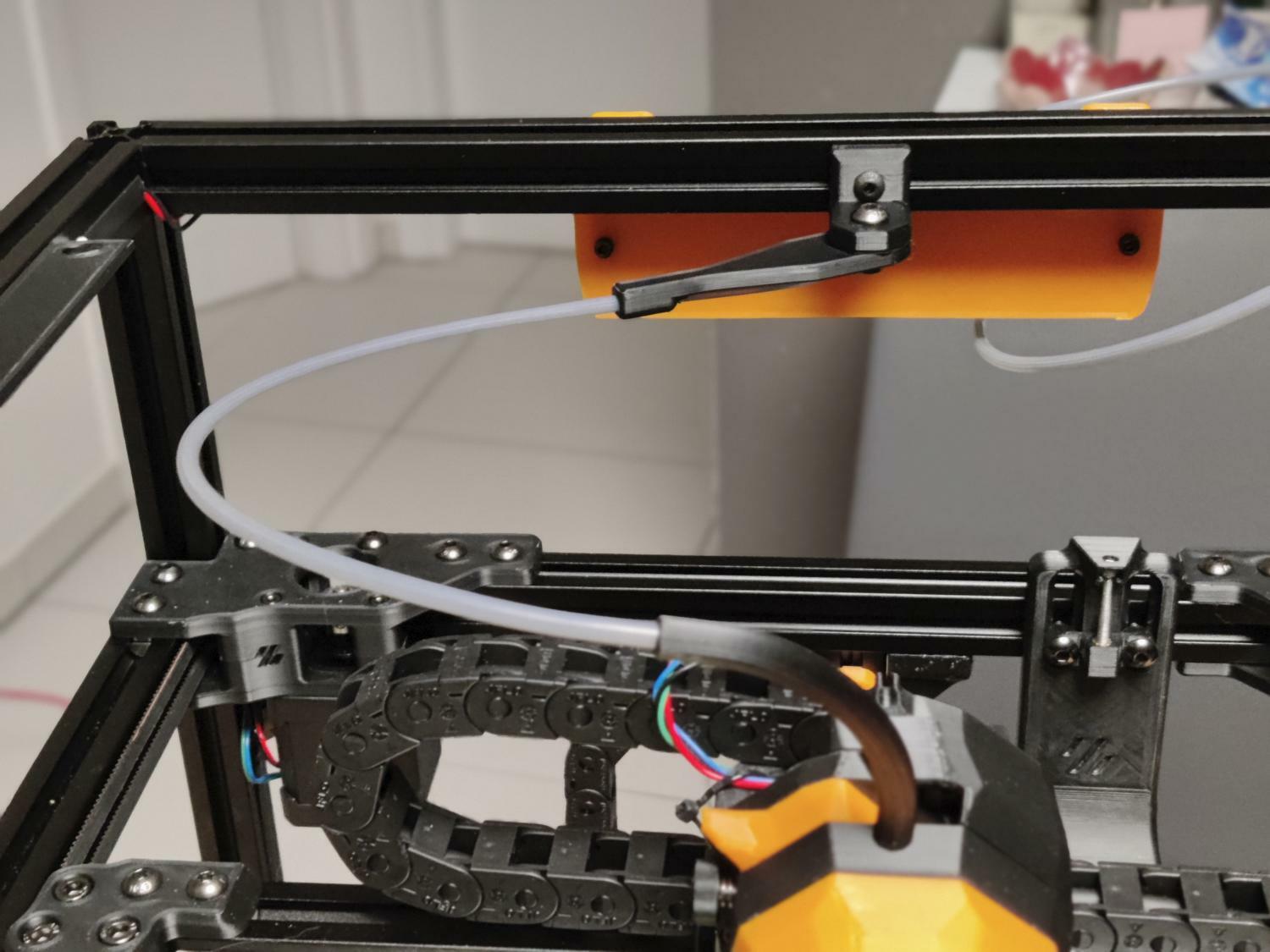 Nel frattempo oggi mi sono portato avanti verso il debutto ufficiale per le stampe serie. Nell'ordine ho Sostituito la spazzola metallica con quella in silicone Ho installato e cablato il filtro Nevermore V6 leggermente customizzato nella parte superiore del serbatoio (ho inserito una retina ulteriore x evetare che i carboni attivi finiscano nelle ventole e sostituito l'apertura Jalousie con un piu' banale coperchio). Nel montaggio finale, poi, mi sono accorto che una delle 2 meta' (quella piu' rognosa da sostituire 🤬) mi ha warpato un po' in stampa quindi non chiude correttamente con l'altra meta'..... piu' avanti la ristampero', tanto ho gia' in cantiere una modifica 😋 Ultima, ma non meno importante, la guida per il tubo PTFE. Non so se sia effetivamente necessario o meno, ma leggendo in giro, alcuni utenti lamentavano lo sballonzolare del tubo durante le stampe che poteva andare ad impigliarsi da qualche parte. Onestamente nn ne ho idea, ma mi piaceva il design e l'ho montato 🙂 Se riesco, domani passo ai pannelli cosi' da completare il tutto e poter cominciare a stampare ABS