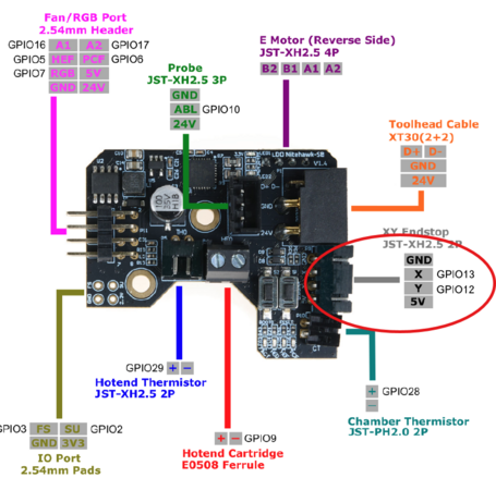 Grazie per la dritta, ho gia' scaricato i cad, la misuro e la confronto con la versione che ho stampato gia'. Relativamente ai collegamenti, lo switch lo tratti come un endstop a livello logico? immagino necessiti di un pin come segnale e GND, io al momento ho questa PBC sulla toolhead e volevo usare il connettore cerchiato come sensore di filamento, a tuo avviso puo' funzionare?