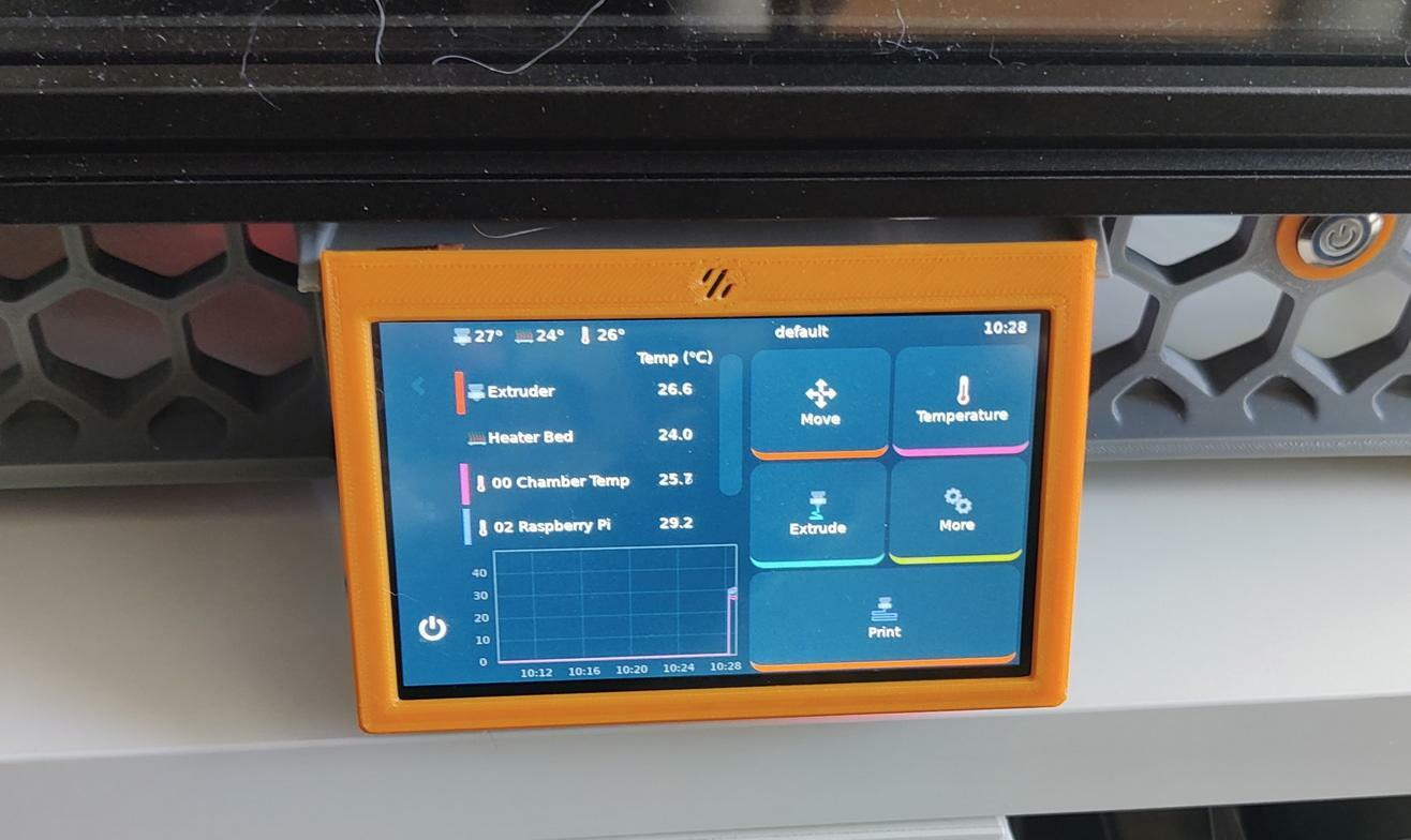 Ehhhh nn ce l'ho fatta a tenermi il monitor incassato, faceva troppo brutto, mi rovinava l'estetica stilosa e dovevo abbassarmi per vedere la temperatura dell'estrusore.... non era cosa....... e quindi raccattato una mod per "estendere" il monitor, rimaneggiata perche' lo faceva sporgere di 20mm di troppo, ridisegnato alcune parti xche' non mi sembravano stilose abbastanza e stampato Ora il weekend mi sorride un po' di piu' 😄😄 Per quanto riguarda la temperatura in camera, questa mod l'ho stampata in poco piu' di 2h e la camera ha raggiunto i 60C (attualmente ho 2 ventole blower 5020 sotto il piatto che sostituiro' con due 8015 axial appena mi arrivano, le ultime due, sulla carta, dovrebbero far circolare il modo piu' efficiente l'aria e migliorare l'uniformita' della temperatura).