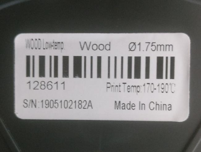 @Killrob... adesso sono piuttosto confuso e ti spiego il perche'. Innanzitutto questa e' l'etichetta attaccata sulla bobina All'interno della confezione c'e' un foglio plastificato che recita User Manual of Wood Low-Temp: print temp 170C-190C, recommended 180C. La primissima torre che ho fatto, per errore, l'avevo fatta basandomi sul PLA Sunlu "tradizionale" che ha un range 190C-220C. Da 210C a 220C, il filamento faceva un sacco di stringing, dai 200C ai 210C c'era poco stringing e sotto i 200 per nulla. Ad ogni modo la torre era cmq fragile e per quello ho riletto meglio le istruzioni e ho visto che era la versione low Temp..... La prova che mi hai chiesto di fare, inconsciamento l'ho gia' fatta..... : -