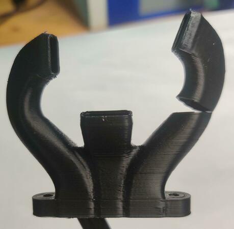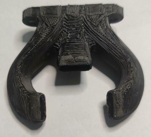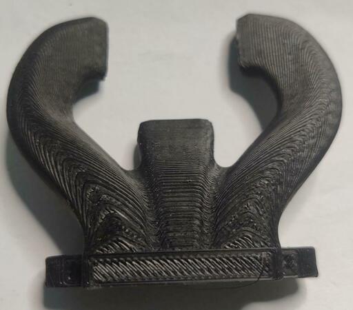 Sante parole, ma sarebbe l'ideale avere sti overhang con PETG e ABS visto che sono questi materiali dove e' piu' difficile staccare i supporti dal pezzo 😞 Ieri, stampando PETG a velocita' smodata (con qualche supporto) sulla CoreXY, appunto un supporto mi ha saccato il Tri-Horn Fan Duct del toolhead Lo avevo stampato come da specifiche (in verticale come da foto) in PETG ma, come si vede, ha militato facendo il suo egregio lavoro per 11 mesi prima di trovare un ostacolo ostico sul suo percorso e dare forfait. Allora mi sono deciso a stamparlo in ABS ma di piatto nonostante sia tutto a sbalzo avendo la bocchetta centrate piu' bassa rispetto ai soffioni laterali. Con mio sommo gaudio sembra tutto andato x il meglio con i supporti che si sono tolti senza intervento di rosario da snocciolare e con una finitura della base (non a vista ma parallela al piatto) piu' che accettabile (con leggero carteggio) e una parte a vista che da' soddisfazione avendo anche cambiato l'orientamento, ritengo sia piu' resistente ad eventuali urti in quanto le forze sarebbero "perpendicolari" ai layer e non "parallele" -