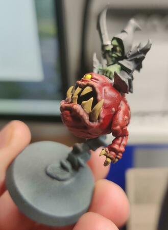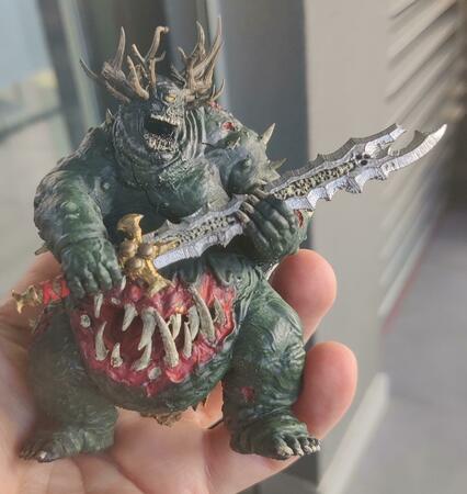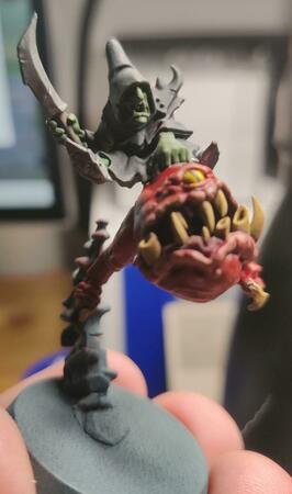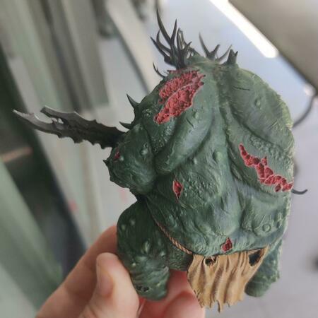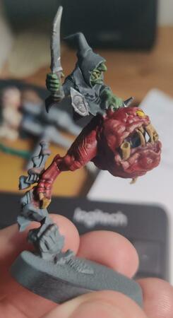Dry brushing l'ho fatto sul corpo (da verde scuro a chiaro) e sulle gengive, come anche sulle corna poi ho voluto passare il tutto con un wash nero per risaltare le ombreggiature ma temo di aver fatto una cagata..... Al corso per dipingere le miniature lo avevamo fatto ed era venuto bene, qui temo che il wash della vallejo che ho usato sia troppo caricato di colore da avermi scurito il tutto 😞 Per quanto riguarda i modelli, sto cercando qualcosa di intermedio da stampare senza troppi dettagli cosi' da potermi concentrare sulla tecnica e, come consigliato, sperimentare. Questo l'ho dipinto perche' era uno "scarto" di mio figlio. Lo avevo stampato per farlo giocare nelle campagne di warhammer con un amico ma ho avuto qualche prob con la resina e dopo un po' si e' spaccato all'atezza del collo (nella foto frontale si nota). Piuttosto che buttarlo, l'ho usato come modello