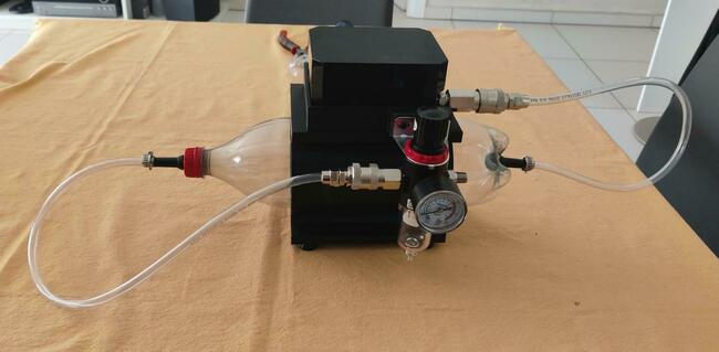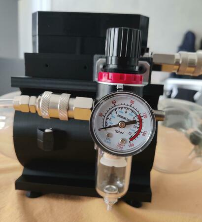 giusto per nn lasciare il tutto svolazzante, ho deciso di realizzare la beta2 del Lepecous1 nel tentativo di farlo assomigliare ad un compressore "serio", ed ecco il risultato Ho quindi realizzato una scocca sagomata sulla bottiglia ed ho inserito tre trisce di isolante per finestre (strisce gialle nella seconda foto) per creare spessore e bloccare la bottiglia senza per questo vincolarla troppo. Sulla parte superiore e' appoggiato il compressore connesso all'air tank che termina con il filtro e regolatore di pressione. Non sono ancora nella versione definitiva in quanto sono in attesa che mi arrivino degli altri connettori e valvole per poter ridurre le curve e le lenghezze dei tubi. Il tutto funziona anche se sospetto che il regolatore finale non sia correttamente dimensionato. In primis, quando attivo il baracchino, il compressore non ha la forza sufficiente per spingere la valvola in basso al regolatore (pirulino argentato in basso nell'ultima foto) e questo provoca una fuoriuscita d'aria. Il workaround e' quello di tirarlo manualmente fino a far aumentare la pressione cosi' che rimanga ingaggiato. Fatto questo, mi sarei aspettato che la pressione arrivasse almeno a 30PSI (manopola del regolatore completamente aperta) essendo il compressore dichiarato fino a 40PSI. Con mio sommo stupore, invece l'ago del misuratore arriva tra la prima e la seconda tacca che, facendo le debite proporzioni, dovrebbe aggirarsi attorno ai 10PSI. Leggendo le specifiche del regolatore, viene data come Operating Pressure range: 0 ~ 1.0MPa (circa tra 0 e 145PSI). Che sia sovradimensionato per il mio compressore?
