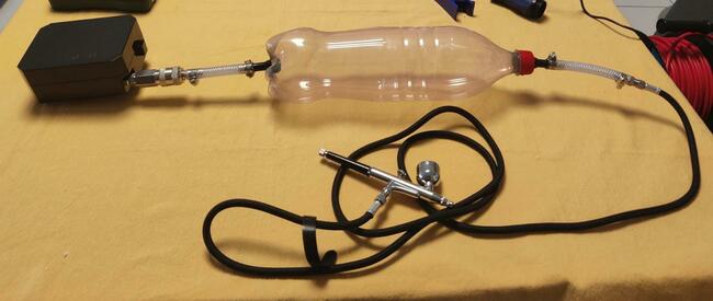In una passata discussione relativa agli equipaggiamenti per la verniciatura ad aerografo, il diavolo tentatore @eaman ha condiviso un suo progetto in cui realizzo' un Air Tank per aerografo per mezzo di una bottiglia PET per bibite gassate. E visto che io nn mi faccio convincere molto facilmente, ho realizzato la mia Questo e' naturalmente il prototipo del progetto Lepecous1 ancora in beta dove ho voluto testare il funzionamento e la resa. Devo dire che il tutto funziona e anche bene, il compressore di suo e' piuttosto basico e impiega un mezzo minuto a mettere in pressione la bottiglia ma una volta passato questo tempo, l'erogazione d'aria dall'aerografo e' costante per parecchio tempo (nella prova l'ho fatto erogare per piu' di un minuto). Senza l'air tank, appena attivata l'erogazione si aveva un getto ad "alta" pressione che subito dopo calava e si stabilizzava, questo portava a fare l'erogazione iniziale a vuoto e poi passare al modello cosi' da non ritrovarsi un eccesso di pittura in un punto. Non ho ancora fatto il test con il primer ma sono fiducioso della resa. Se qualcuno fosse interessato, qui di seguito le componenti che ho utilizzato 1 x Bottiglia di bibita gassata (ho fatto un test con una da 500ml e una da 1.5L, con quest'ultima la resa e' migliore) 2 x valvole per camere d'aria da auto/moto 1 x attrezzo x rimuovere il nucleo delle valvole (necessario almeno per la valvola di uscita, ma vista la poca potenza del mio compressore, necessaria anche per la valvola di ingresso) 1 x tubo di raccordo lunghezza qb, diametro intero 6mm (io ho preso al brico quello per acqua con magliatura in nylon) 4 x fascette per tubi con vite (meglio prenderne piu' di 4) 8-12mm 2 x giunti a seconda delle necessita'(tipo1 o tipo2 o mix) 6mm 1/8" qui poi dipende da come si intende collegare l'air tank Come detto, il progetto e' in beta e necessiata di alcuni aggiustamenti, tecnici ed estetici, ad ogni modo quello elencato sopra e' lo "starter kit" minimo 😄