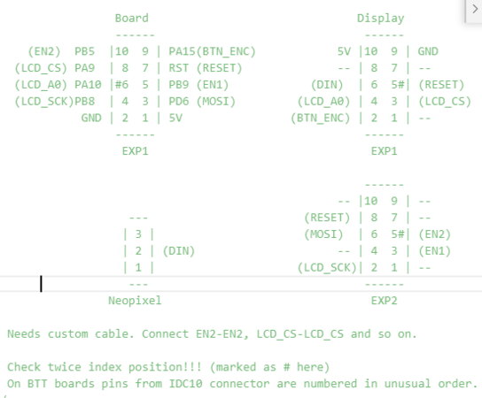 20. Ciao @Salvogi e grazie per il feedback. Nell'unico post trovato che tratta lo stesso problema, chi scrive ha fatto questi test con questi risultati: - RESET solo su EXP1: al 90% dei boot, il display funziona, per il rimanente 10%, hard reset (con pulsante su MB) o OFF/ON dell'alimentazione - RESET solo su EXP2: schermo sempre non funzionante (vedi foto sopra) - RESET su EXP1 e EXP2: da quanto riportato, il display "spesso funziona" come anche il tasto RESET. Dalle poche prove fatte, viene riportato un 50% di successi Alla luce di quanto ho trovato (e allo sbatti nel creare un cavo custom) credo provero' la terza opzione e vedro' se migliora o meno Sad but True, sembra che passando dalla versione v1.0 alla v2.0 del display (e con la v3.0 cambia ancora) il pinout sul display cambia e i due pinout non sono "compatibili". Inoltre, da quanto trovato, il pinout della SKR mini E3 V3 e' completamente stravolto rispetto a quello delle versioni precedenti e quindi da affrontare con un cavo ad-hoc. Ultimo ma nn da meno, trovo assurdo (e nn sono il solo) che un produttore come BTT nn fornisca o almeno non commercializzi un dannato cavo pre-assemblato per le varie versioni del sui display con le sue schede..... 😞
