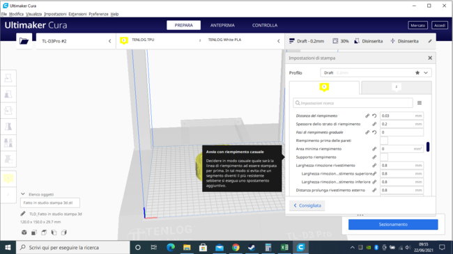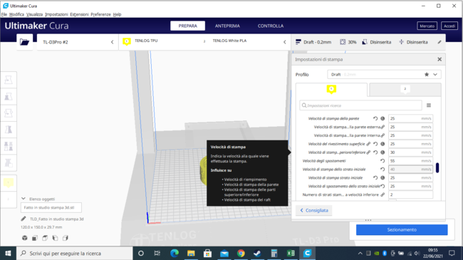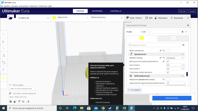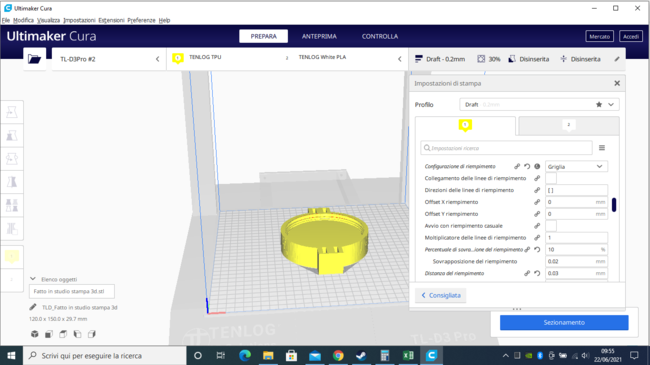 Allora...adesso, dovrei essere pronto...potreste dirmi se draft nella parte superiore in grigio devo lasciarlo 0,2 o passare a coarse 0,4...poi a parte questo mi confermate che devo settare: - Altezza layer = 0,2 [mm] -Larghezza della linea = 0,4 [mm] -Larghezza linea strato iniziale 100% - numero delle linee perimetrali (se la larghezza è 0,4 devo mettere 2, giusto? (0,4 x 2 = 0,8 spessore pareti) - Spessori strati sup/inf = 0,8 [mm] --> numero strati 4 - sovrapposizione tra riempimento e pareti = 30 % - Spessore dello strato di riempimento = 0,2 [mm] - Temperatura = 220° - T iniziale piano = 70° - T piano = 55° - Velocità di stampa = 20 [mm/s] - Velocità di stampa delle pareti e sup/inf = 10 [mm/s] - Modalità combing = tutto --> aggiramento delle parti stampate durante lo spostamento = attivo, distanza aggiramento = 0,625 - Controllo accellerazioni e jerk = disattivati - Raffreddamento = disattivato % di sovrapposizione del riempimento = 30% spessore dello strato di riempimento = 0,2 --> non dovrebbe essere 0,4? Le parti in rosso sono quelle su cui ho maggiori dubbi...la velocità di stampa è stata alzata a 20 mm/s... Per favore, mi dite se provo con questi parametri se potrebbe funzionare? -