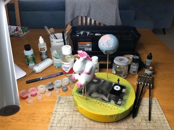 Ho fatto un test lasciando un pezzo di resina a mollo e non si é sciolta ma é diventata molto gommosa e dato che era una lastrina 25x17x2mm si é imbarcata alla grande,la resina era un mix custom di 80% Siraya fast bianca + 20% Monocure Flex 100 + 20 gocce di pigmento nero + 2 gocce blu...un mio esperimento alchemico 🧙‍♂️ Bello ma mi sembra poco pratico cosi' comé durante la pittura,hai le boccette dei colori tra gli zebedei,controlla bene le misure perché é fatto per i Testor roba USA che in Europa e anche qui non si trova quasi piu' ,sarebbe interessante fare un sistema per separare il portacolori e piattaforma girevole quando ti serve e riunirla per il trasporto/stoccaggio,sarebbero utili anche dei fori sulla piattaforma per infilare stuzzicadenti e altro per tenere i pezzi....un bel modello di partenza mi sà che lo scarico anche io!....Grazie! Io uso una scatola porta attrezzi quando non lavoro in Garage,bella l'idea con la Wet Pallet incorporata!...👍....anche io uso lo stesso tipo di Tapperware della Sistema ma quella quadrata per i Toast...🥪 Una Sezione Modellismo andrebbe a fagiolo!...per mé la cosa migliore per imparare con l'Aerografo é comprare un modello non troppo piccolo ma da poco anche se non é un soggetto che ti interessa e buttarsi a testa bassa,anche perché la carta e le superfici piatte insegnano ma solo fino ad un certo punto, non essendo in 3D il flusso reagisce in modo differente e la carta essendo assorbente nasconde molti errori. Al momento io sto lavoricchiando sulla Seconda Morte Nera di Bandai nella scala piu' ridicola mai vista 1/2700000!! E per mia nipotina l'Unicorno dei Mignons stampato da me,mancano ancora solo un paio di dettagli.... Questo é il mio setup da salotto...