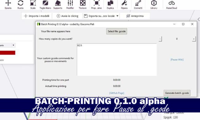 Ciao a tutti. Un mio followers mi ha chiamato spiegandomi un piccolo progetto che ha creato. Come sempre credo che parte della forza del canale derivi dall'ascolto della community e dalla visibilità che può dare anche a piccole attività neonate. *il progetto è appena nato e viene reso noto agli utenti del canale di Fabula proprio per farlo testare ad un pubblico preparato sullo slicing e sull'uso di stampanti 3D FDM. Scarica il programma su Github. Abbiamo accorciato i tempi e Giacomo ha pubblicato la versione alpha su Github al link Batch Printing 0.1.0 alpha. Prima vi tutto ti ringrazio per la disponibilità. Se doveste trovare qualche bug/problema o mancanze nella pagina Github faccelo sapere all'interno di questa stanza sotto a questa discussione. Ho programmato una diretta venerdì 16 Aprile alle 21.00. Ricevi il promemoria! -