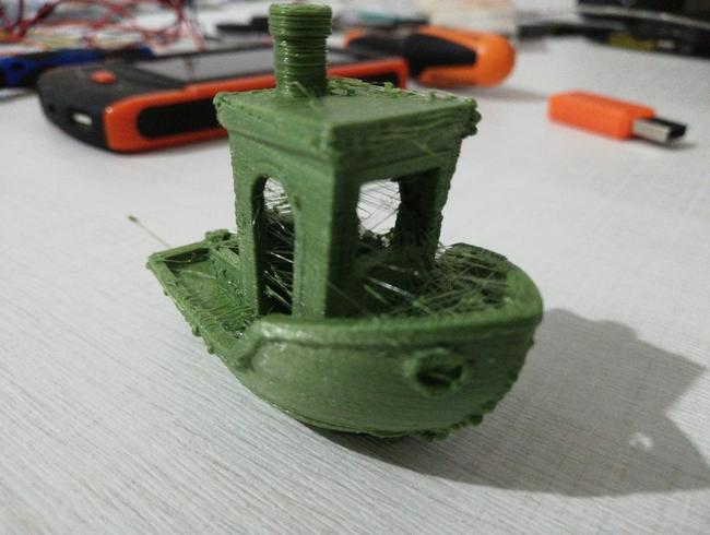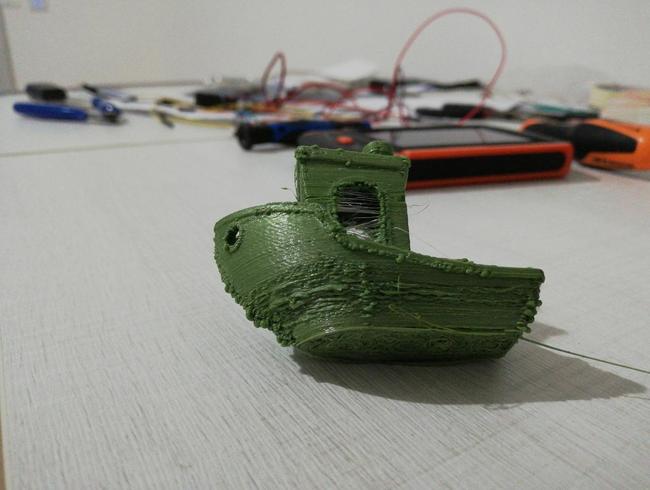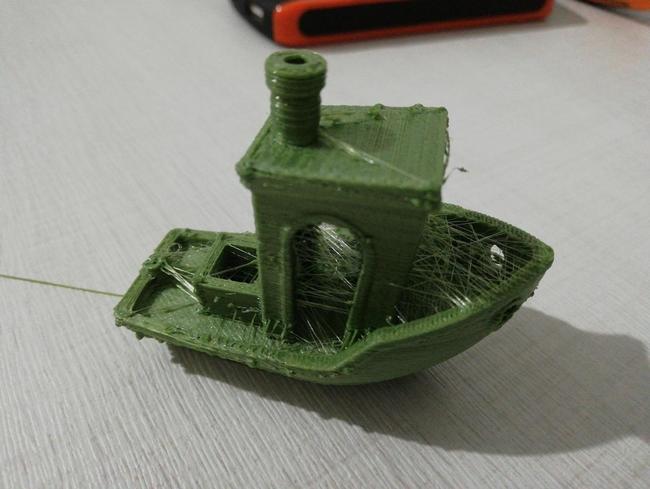 16. Ecco qua, l'ennesima barchetta... Che a parte le solite "stringhe" ora pare che abbia dei problemi anche sull'estrusione (su hotend).... Si vedono bene "palline" di materiale sovra-estruso sugli spigoli della barchetta, e una fiancata pare "ammaccata"! Una cosa strana che ho notato mentre stampava, è che l'ugello saltellava da un punto all'altro della barca, estrudendo un po' di materiale, come se tentasse di creare dei punti... Devo anche aggiungere che le impostazioni di Cura le ho un pò rimaneggiate: Retrazione 7mm, Z-hop abilitato con parametri base proposti (per vedere se migliorava lo stringamento), temperatura 235°, poi abbassata a 220° a metà della stampa (che in effetti sembra venuta un po' meglio. Mi sa che devo rifare le calibrazioni base....