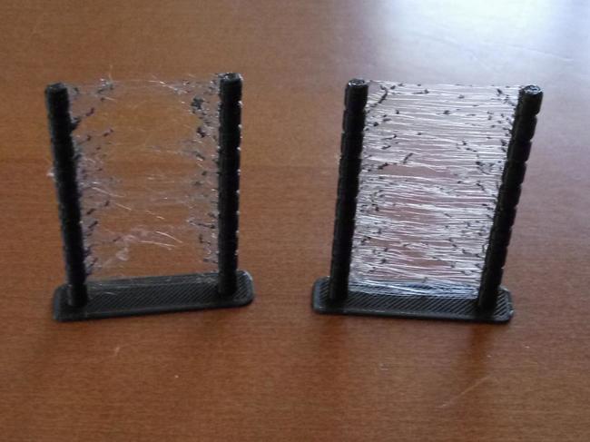 Ho creato 2 torri di retrazione col nuovo estrusore e nuovo bowden. Anche qui abbiamo i filamenti, sebbene meno fitti, e più presenti ai due lati che non al centro. A vedersi, sembrerebbe che ci siano meno filamenti con una distanza di 4.5 mm e una velocità sui 50 mm/s. Ora vado a fare la calibrazione dell'estrusore, poi rilancio la stampa delle due torri in questione. -
