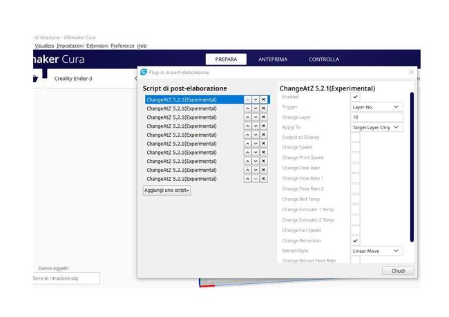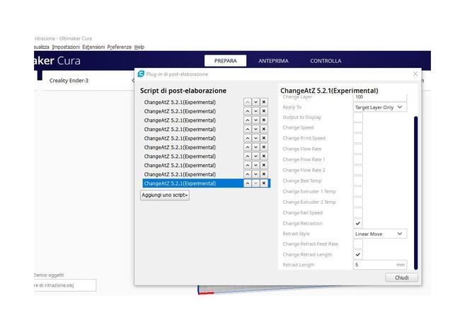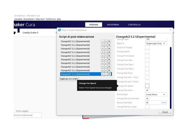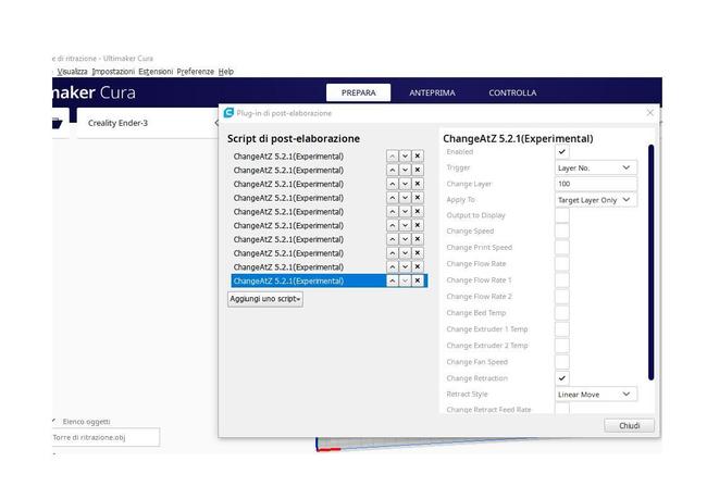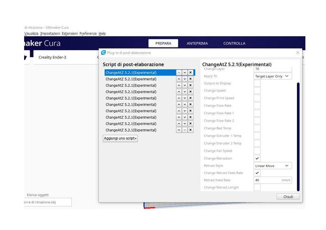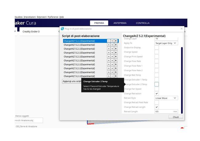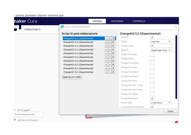 Problemi di retrazioneVanVan200 ha risposto a VanVan200 nella discussione Problemi generici o di qualità di stampa Comunque poi sono riuscito ad installare i due scripts di Dnasini su RetractTower e TempTower, in quanto probabilmente per via di un aggiornamento del software, queste due opzioni erano sparite; ho tolto l'aggiornamento, e sono ricomparse (Changeatz consigliato da Killrob ho provato, non andava bene). In questo modo, con Cura sono riuscito a progettare le due torri con tanto di parametri collegati. Ora le ho mandate in stampa.