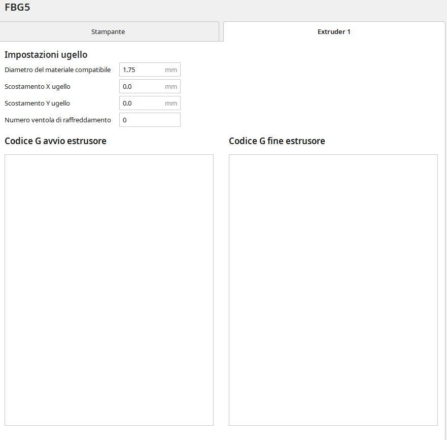 12. Ho comprato da poco una FBG 5 e dopo tutte le calibrazioni mi sto approcciando allo slicer. Volevo chiedervi se avete un gcode iniziale e finale con cui vi trovate bene perchè al momento sto utilizzando il seguente codice in allegato, trovato all'interno di cura, selezionando la stampante. Ci sono codici superflui che possono essere tolti? o magari posso aggiungerne altri per migliorare la qualità della stampa? Vorrei insomma capire i comandi da scrivere, e ovviamente come scriverli, per avere un risultato ottimale in tutte le stampe future. Vi ringrazio anticipatamente per le dritte!