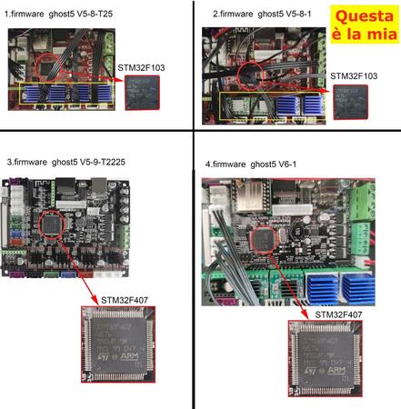 Ciao Lanjazz il post a cui fai riferimento è il mio, le informazioni e il link, come descritto nel post stesso, vengono dal produttore tramite la chat su AliExpress. Secondo me la cosa migliore che puoi fare è contattarli via chat inviandogli la foto per vedere se confermano la versione del firmware adatta alla tua scheda. Non mi stupirei se le info non fossero accurate .... Tuttavia se ti fa la maggior parte dell'aggiornamento e poi si ferma ai font potrebbe essere il pannello TFT che ha problemi oppure è un modello diverso da quello normalmente abbinato alla scheda. In merito ai firmware purtroppo c'è una giungla e mancanza totale di chiarezza tanto che i firmware che si trovano qua e la vedo che non tengono conto dell'hardware installato, sia in termini di processore (comunque sono entrambi a 32 bit e magari le istruzioni sono identiche) ne di driver (e qui la storia invece è determinante perchè se metti il firmware, e relativa configurazione, sbagliato certi motori ti possono girare al contrario, a meno che il firmware sia in grado di interrogare i driver, magari con protocollo I2C o SPI mo similari, per poi gestirli correttamente). Dunque, come già scritto in questo thread, io mi guarderei bene da installare firmware da fonte sconosciuta o, quanto meno, prima mi accerterei di avere la versione del produttore e poi magari mi posso azzardare a provare qualcuna di queste "varianti". Sempre sperando che non vadano a toccare il bootloader (dovrebbe spero essere protetto). Comunque facci sapere così magari si riesce a fare un po' di chiarezza intorno a queste FBG5 che non sono tutte uguali alla fine. Per esempio, la mia, che è stata presa a maggio, è quella in alto a destra. Ah, un'ultima cosa ... perchè hai voluto aggiornare il firmware ? Che versione ti indicava a pannello ? Sempre il produttore 1 mese fa mi ha detto che l'ultima versione è la 5.8. -