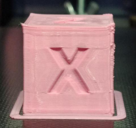 Eliminando il fattore stringing, le mie stampe continuavano ad avere altri problemi e quindi ho iniziato a stampare dei cubi di calibrazione come test. Allego uno dei test fatti e si può notare che i layers sono molto vistosi e privi di uniformità ed inoltre ci sono dei rialzi agli angoli.