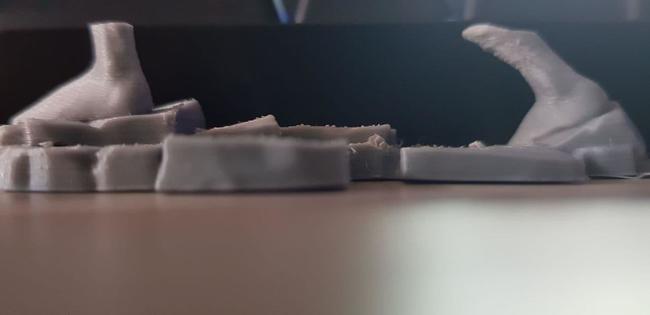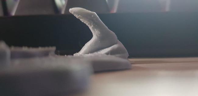 gli angoli a sbalzo vengono stampati veramente male. I layer stampati si alzano (curling) ed il nozzle ci ripassa sopra, mentre la parte inferiore dello sbalzo esce tutta sbavata (allego immagini)