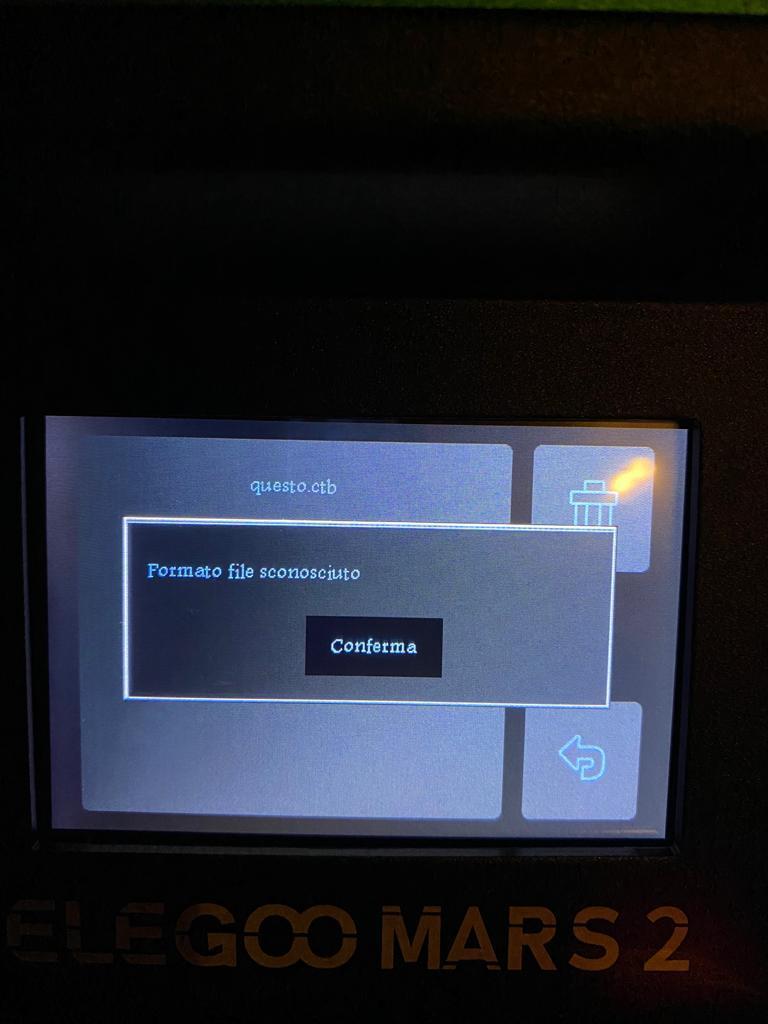 2. Ciao a tutti ho appena acquistato la mia prima stampante 3d a resina, dopo averla montata correttamente faccio fare la stampa di prova degli scacchi e sono rimasto sorpreso dalla qualità. Il problema inizia quando devo stampare dei file che converto in codice con CHITUBOX. Il file che esporto è in .ctb come quello di prova della stampante, eppure la stampante non lo riconosce e mi dice formato sconosciuto. Non so cosa fare aiutatemi, ho aggiornato anche il software della stampante e nulla Premetto che non ho toccato nulla nelle impostazioni, ho aperto il CHITUBOX ho inserito il file .stl poi ho fatto slice e poi ho salvato il file in formato .ctb ma non funziona