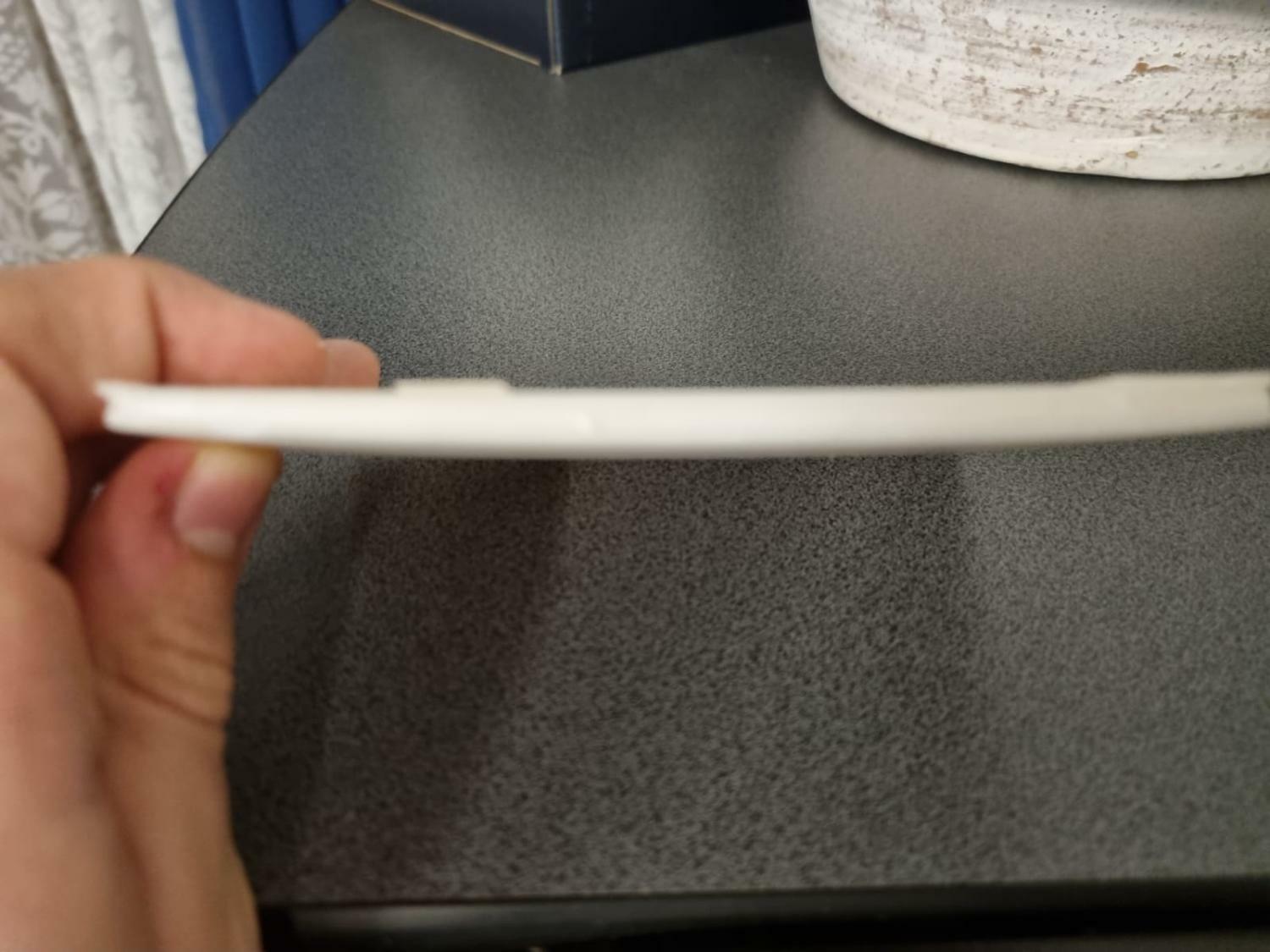 Il problema è però nato da un oggetto di dimensioni un po' più grosse, per la precisione un case per una PCB. In questo caso, una volta terminata la stampa, l'oggetto non era sul piatto, e quando ho rimosso la resina liquida rimasta l'ho trovato incompleto, ma non attaccato, sul fondo. Di seguito allego le foto della stampa fallita e del progetto. La cosa strana, oltre all'inarcatura della base, è il suo spessore di 0.6mm contro 0.2mm di progetto, come se la stampante avesse continuato a depositare layer su layer per molto più tempo.