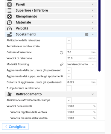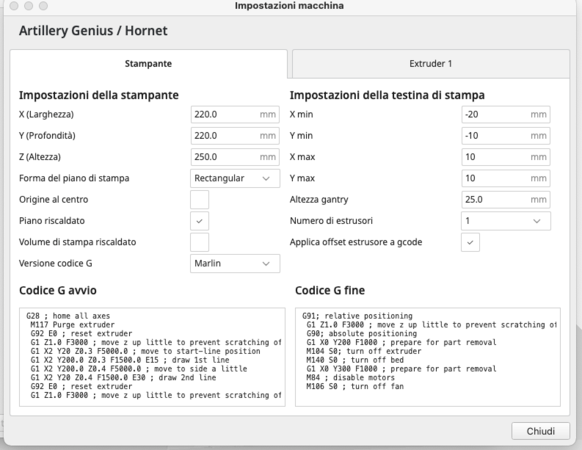 ciao , se posso essere d'aiuto..... sulla mia hornet dopo aver livellato il piatto , ho scaricato/installato cura ,sono andato in impostazioni macchina ho caricato il profilo della artillery genius, ho modificato la grandezza del piatto 220x220x250, e modificato la retrazione mettendo un valore tra 5 e 7 , poi ho iniziato a stampare. Start e End G-code li ho lasciati cosi com'erano. -