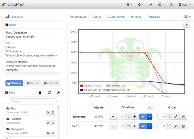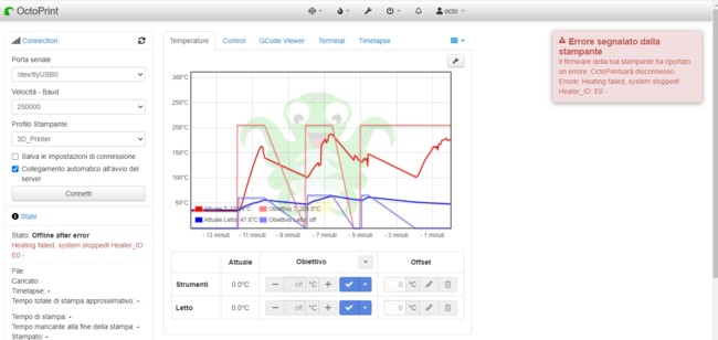 Problema tempeatura e stop stampaSpugno ha pubblicato una discussione in Problemi generici o di qualità di stampa Ciao a tutti, ho una anycubic i3 mega s e la uso con octoprint. Oggi ho provato 3 volte a fare una stampa da 6 ore. La prima volta si è fermata dopo 4 ore, la seconda dopo 2 e la terza dopo 3.... L'errore sempre lo stesso in temperatura e qua allego l'immagine del grafico di octoprint.. Cosa dovrei fare secondo voi? ci sono prove per verificare dove sta esattamente il problema? Grazie Matteo
