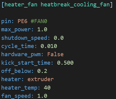 Qualcuno ha qualche idea del perché con la ventola al 100% sui pin misuro 0,2 volt ? La configurazione è questa sotto e quando scaldo l'hotend mi mette correttamente la ventola al 100% però la tensione non va a 24v come dovrebbe... Ho provato ad assegnare una generic_fan e a cambiare manualmente la velocità ma non gira nulla... Il pin di alimentazione è corretto (infatti sugli altri misuro 0 volt, non 0,2). -