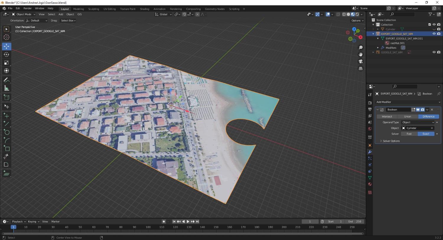 Immagino che l'addon sia BlenderGis... Per eliminare delle aree dalla mappa creata in maniera rapida, puoi modellare in 3D l'area da eliminare (es. il mare o l'isola) e applicare un modificatore booleano. P.s. per l'elevazione hai la Api Key di OpenTopography, giusto? esempio con un cilindro Differenza con mod booleano -